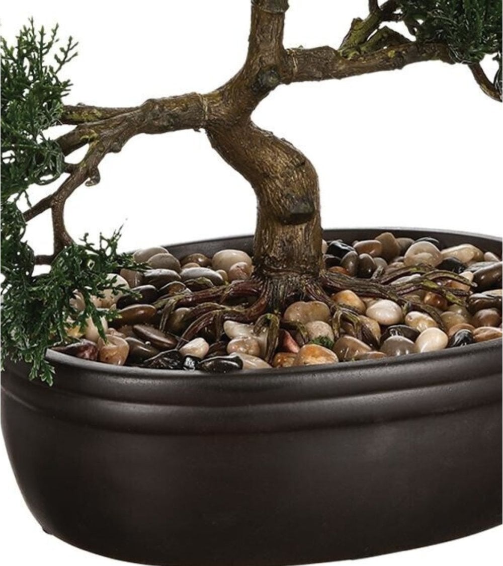 Bonsái artificial elaborado en polietileno de alta calidad con una maceta de cerámica en color negro. Además, incluye piedras decorativas en su base, perfecto para darle ese toque de naturaleza a cualquier espacio.