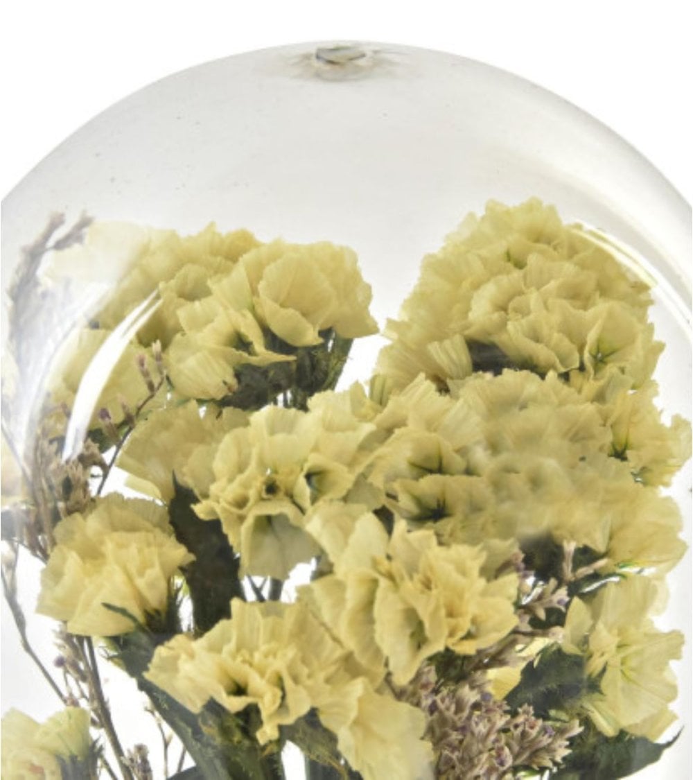 Decoración con tapa de cristal en forma de cúpula y base de madera con un ramito de flores secas en su interior. Disponible en dos modelos surtidos.