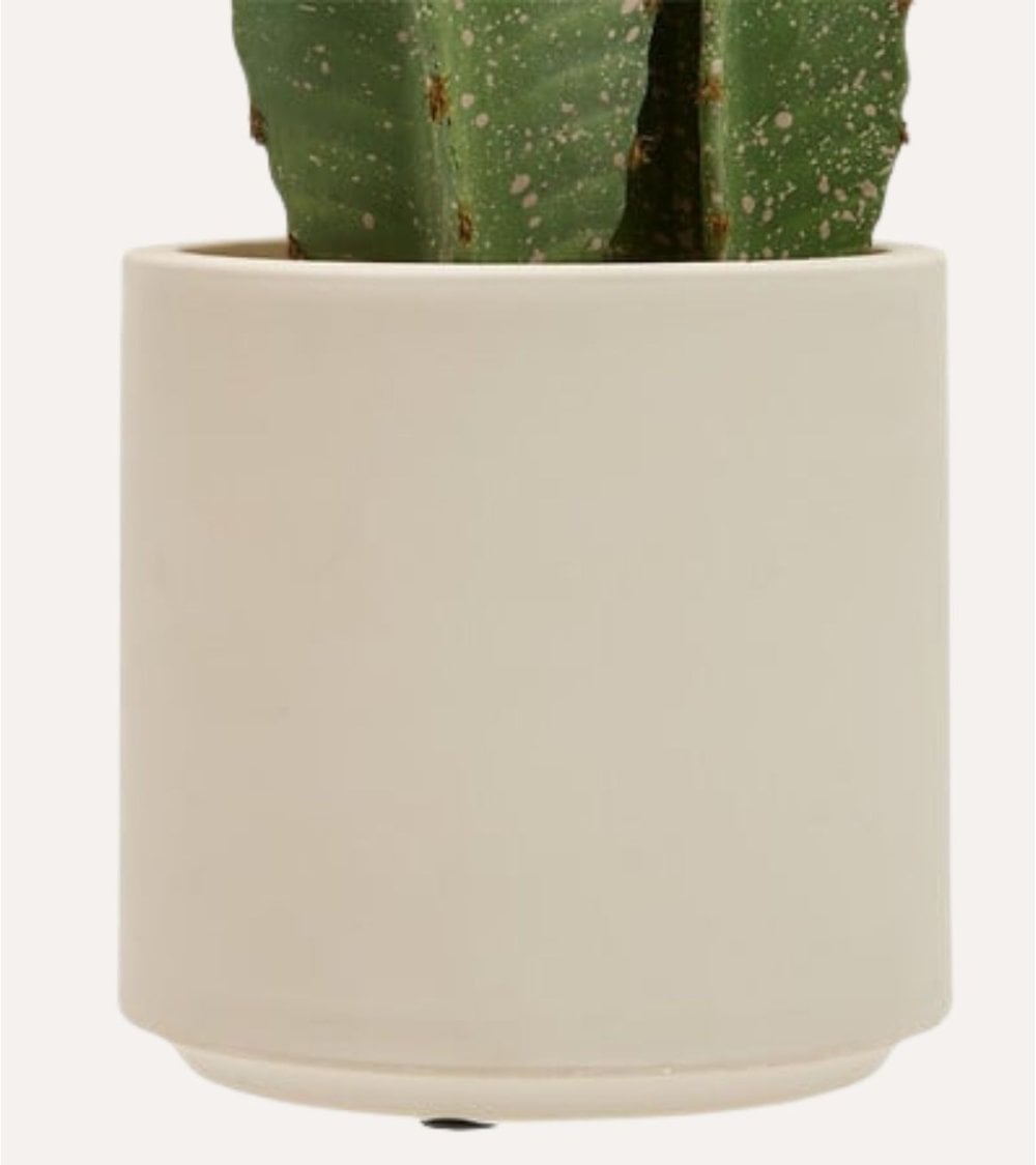 Su estructura de 3 troncos de distintas alturas crea un efecto visual equilibrado y elegante, perfecto para decorar salones, recibidores, oficinas o comercios. Cada tronco presenta detalles cuidados, con relieves y matices de color que imitan las texturas de un cactus real. La maceta de plástico aporta estabilidad y un diseño minimalista que se adapta fácilmente a diferentes estilos decorativos, desde ambientes nórdicos hasta propuestas más rústicas o industriales.