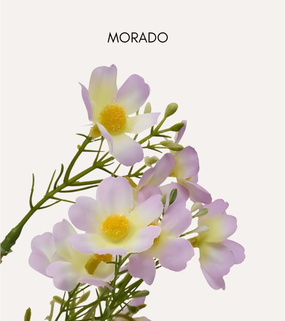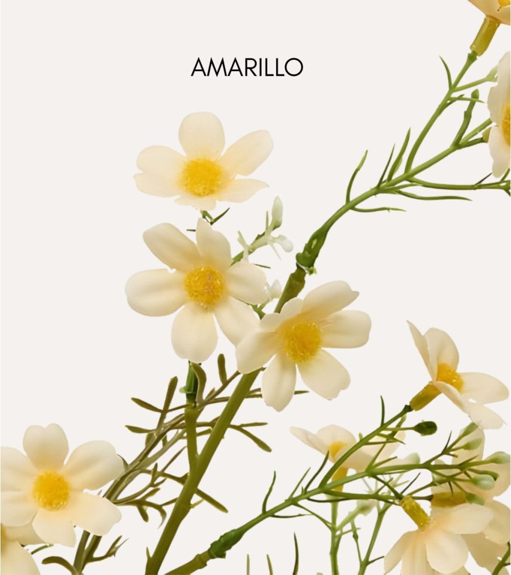 - Diseño: Tallos finos con ramilletes de flores de cosmos en amarillo, rosa, morado y blanco.