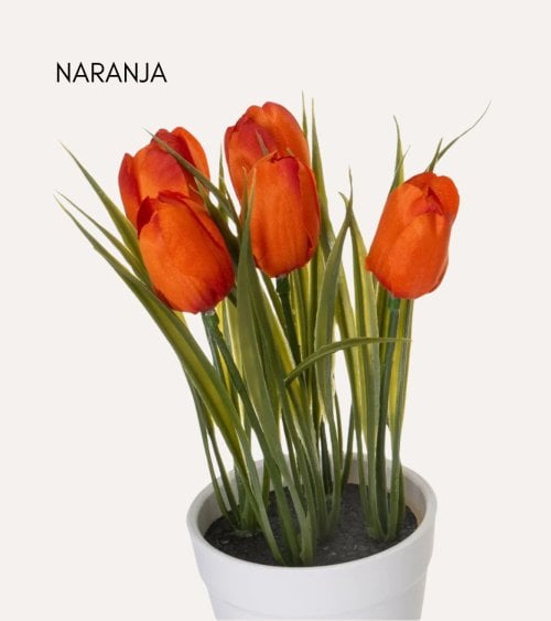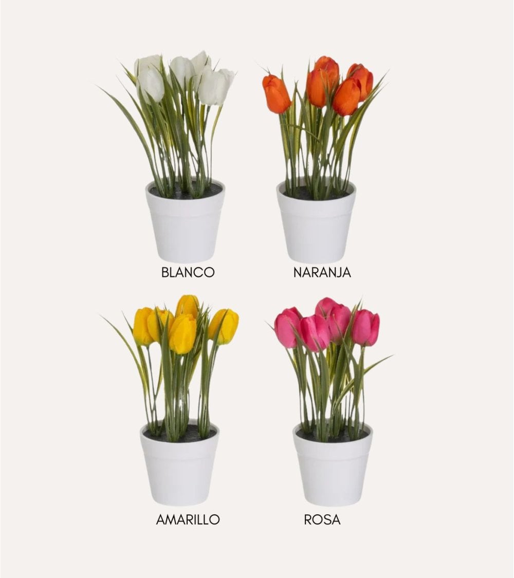 Esta maceta blanca con 5 capullos de tulipán de color vibrante es perfecta para dar un toque de color a cualquier espacio. Disponible en blanco, naranja, amarillo y rosa, esta planta artificial es una opción ideal para aquellos que buscan belleza sin el mantenimiento. Sus medidas son 8 x 8 x 19 cm, tamaño perfecto para cualquier rincón.