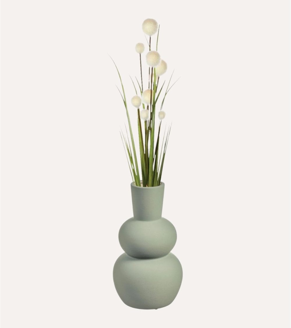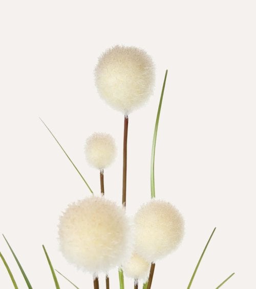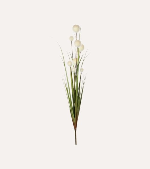 Las esferas suaves y redondas contrastan maravillosamente con las alargadas hojas de hierba, creando un punto focal visualmente atractivo en cualquier entorno. Ya sea que lo coloques en tu sala de estar, oficina o cualquier ambiente interior, este arreglo seguramente mejorará la atmósfera y dará vida a tu espacio.