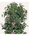 - Flores: Presenta numerosas flores de hibisco en tonos rosa pálido con acentos más oscuros, dispuestas estratégicamente entre las hojas para un equilibrio visual atractivo.