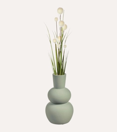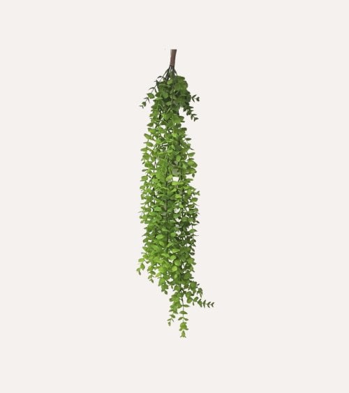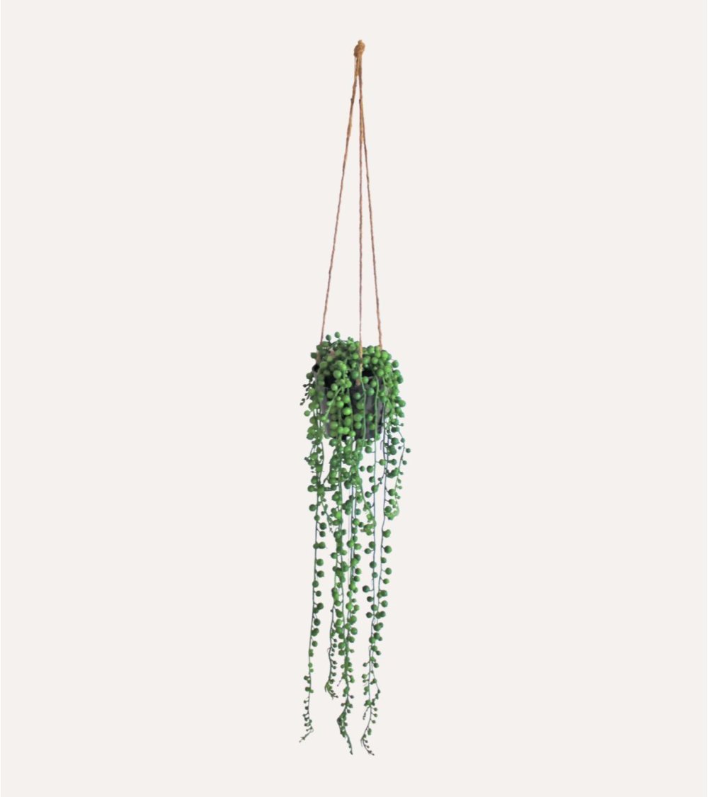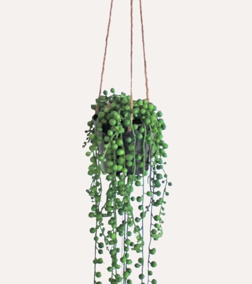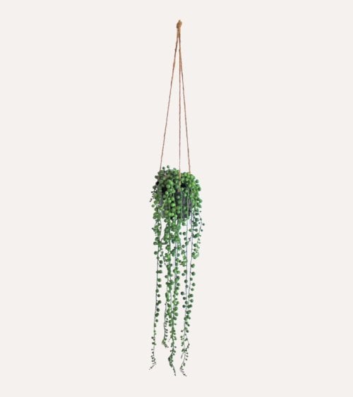 Apariencia General: Con un diseño en cascada, esta planta presenta múltiples tallos largos que cuelgan elegantemente, imitando el crecimiento natural de las suculentas. La parte superior es más densa, con un grupo de hojas y pequeñas cuentas redondas que se asemejan a las suculentas reales.