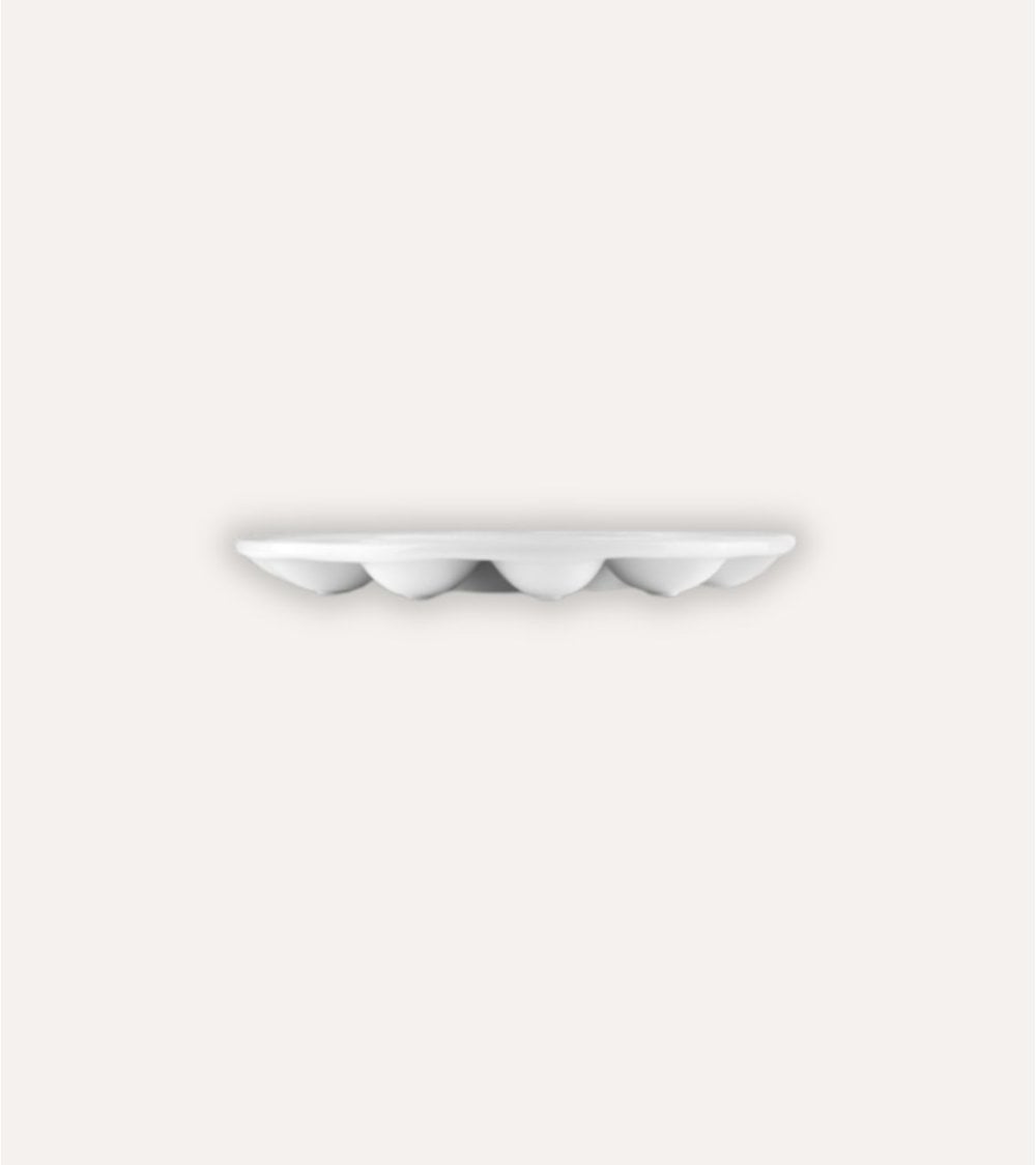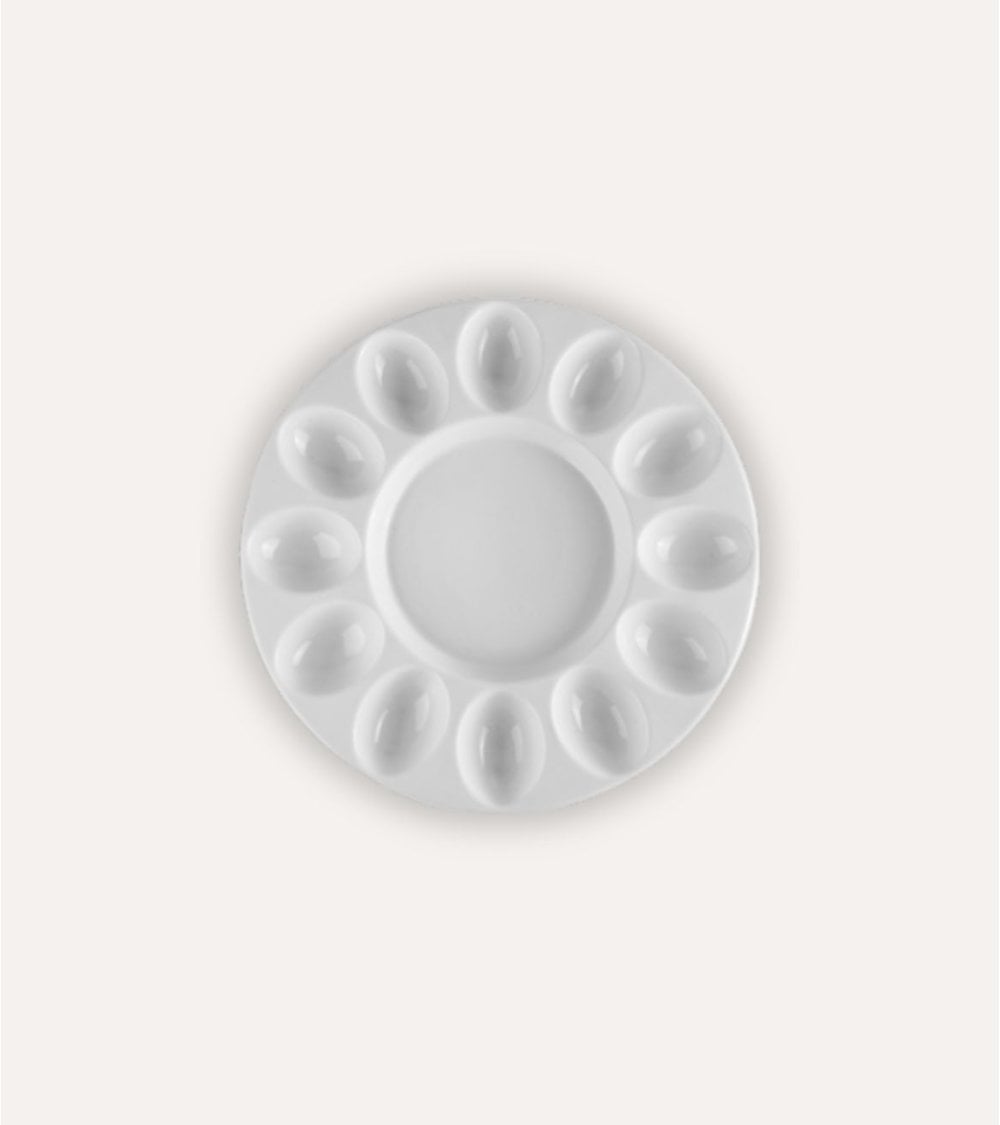 Fabricado en porcelana blanca de alta calidad, este plato de 26 cm de diámetro, destaca por su acabado brillante y superficie lisa, que facilita la limpieza y garantiza una durabilidad excepcional. Su diseño ovalado incorpora 12 cavidades individuales, perfectas para colocar huevos o pequeñas porciones de alimentos, salsas o acompañamientos, manteniendo cada elemento separado y presentable.