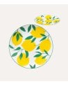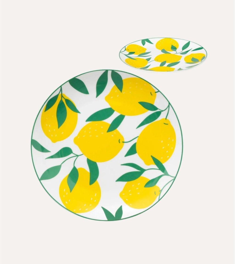 Con un fondo blanco que realza la luminosidad del diseño, el plato presenta un encantador patrón de limones amarillos, cada uno meticulosamente detallado para capturar su textura natural. Las hojas verdes que acompañan a los limones añaden un contraste refrescante, mientras que el borde verde proporciona un toque final sofisticado.