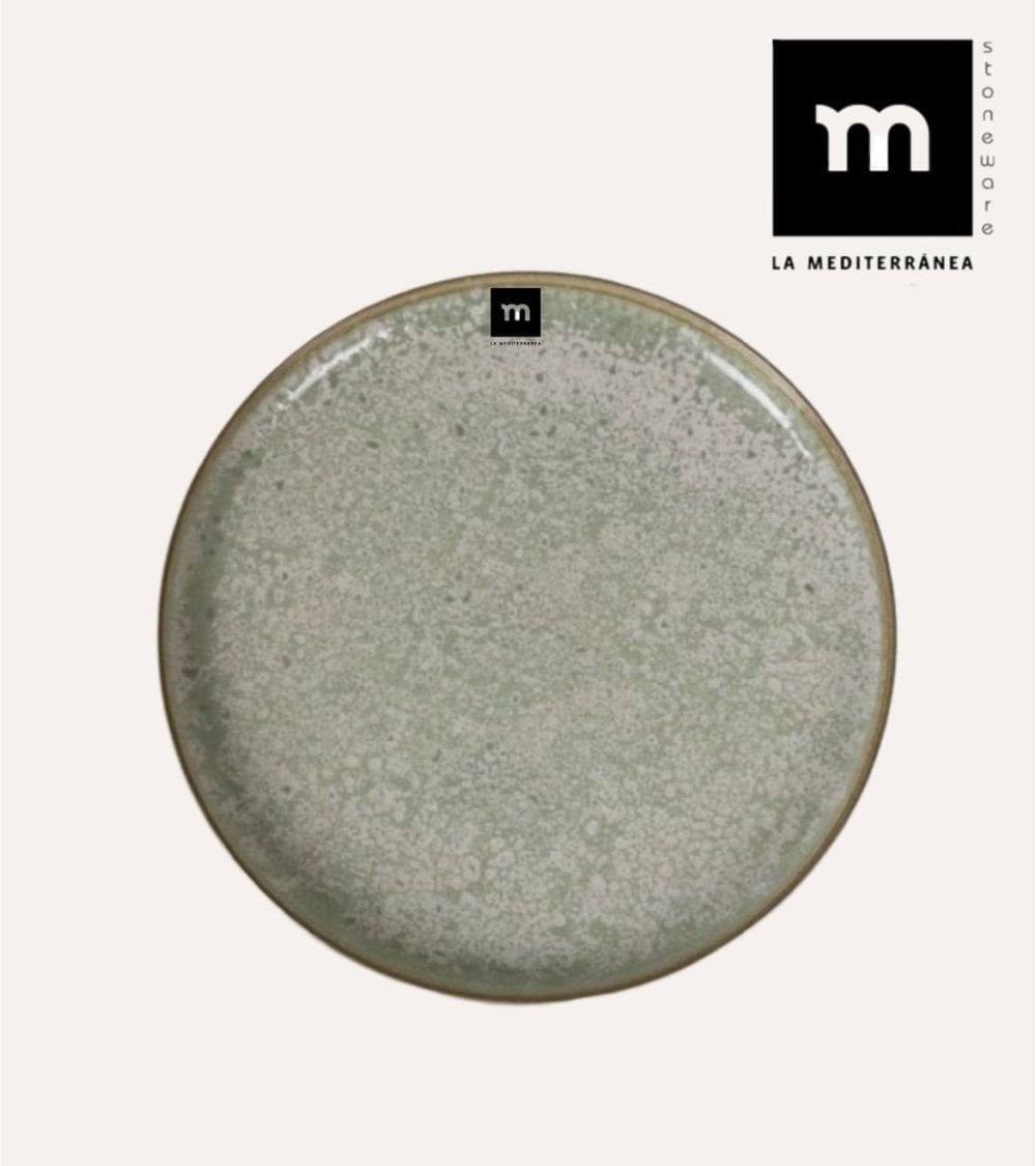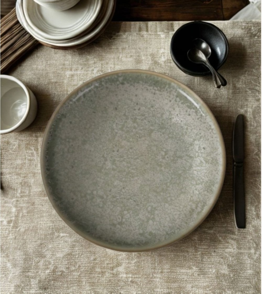 Color y Acabado: La superficie del plato presenta un suave tono verde apagado que evoca la naturaleza. Su acabado esmaltado con textura moteada añade profundidad visual, mientras que las motas más claras aportan un atractivo adicional al diseño general.