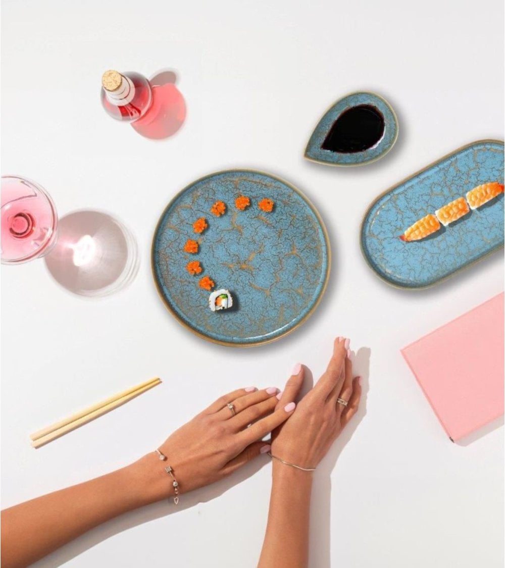 El color azul pastel suave del plato, combinado con un acabado brillante, le otorga un toque sofisticado a tu mesa. La característica más notable es su glaseado craquelado, que presenta una red de finas líneas doradas sobre la superficie azul. Este detalle no solo añade un elemento visual cautivador, sino que también proporciona una textura interesante al tacto.