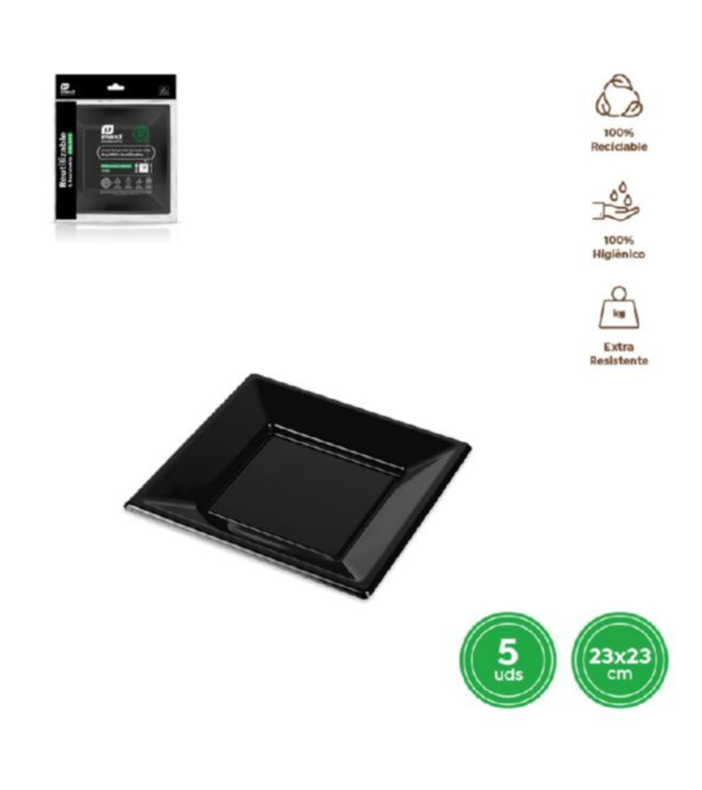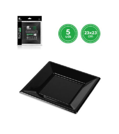 Plato Llano de Plástico Reutilizable Negro 23x23 cm S/5 - Utensilio de Cocina