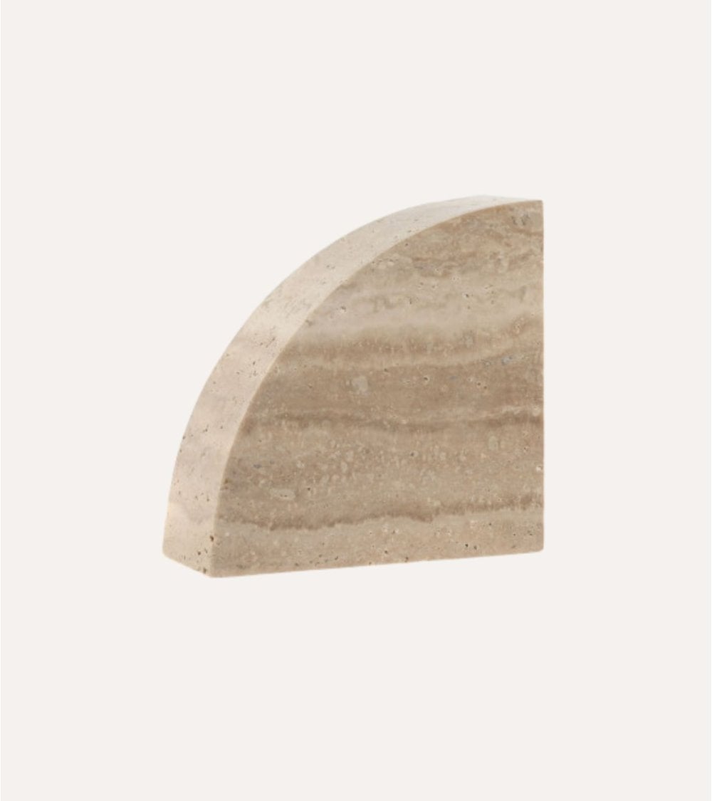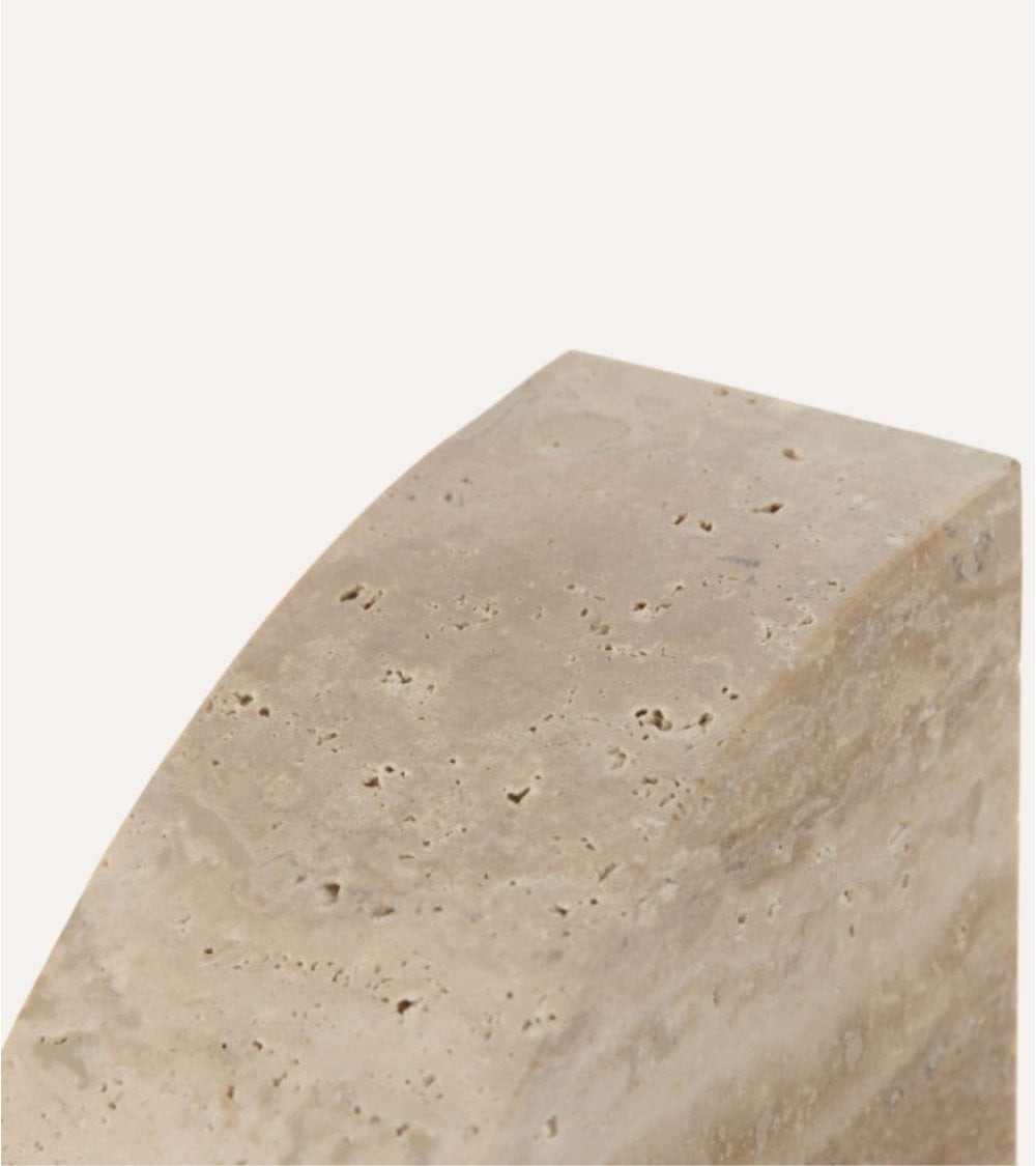 El travertino es conocido por su textura natural y sus variaciones de color únicas, lo que significa que cada pieza es verdaderamente única. Con un diseño curvado que recuerda a un medio cilindro, este sujetalibros presenta una estética moderna y minimalista. Su lado plano proporciona estabilidad, mientras que el lado redondeado aporta un elemento visual atractivo.