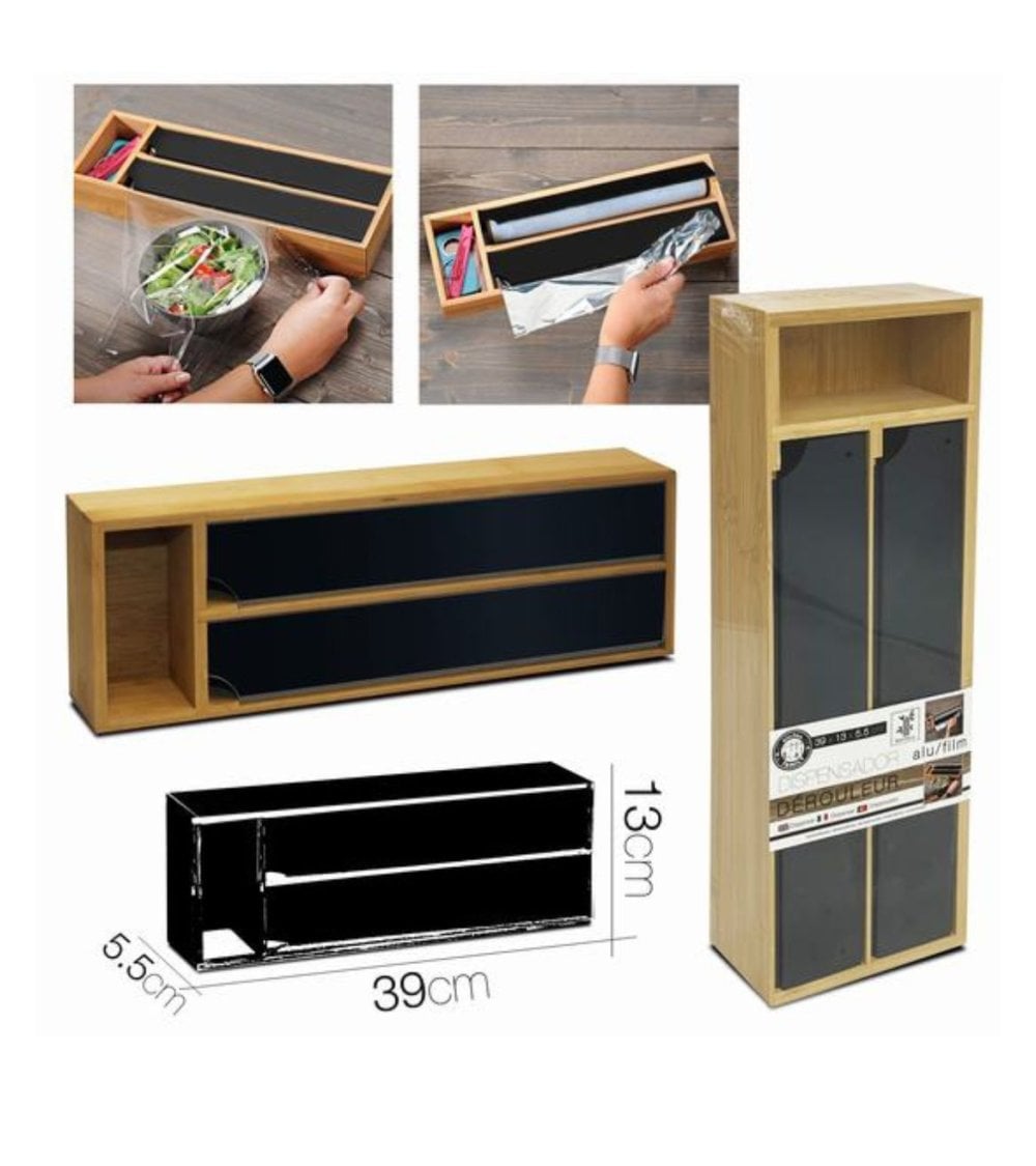 Este dispensador de bambú de 39cm es perfecto para almacenar y dispensar papel aluminio y film. Su diseño elegante y funcional se adapta a cualquier cocina, mientras que su construcción de bambú garantiza durabilidad. Fácil de usar, este dispensador es una adición esencial para su hogar.