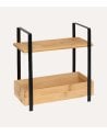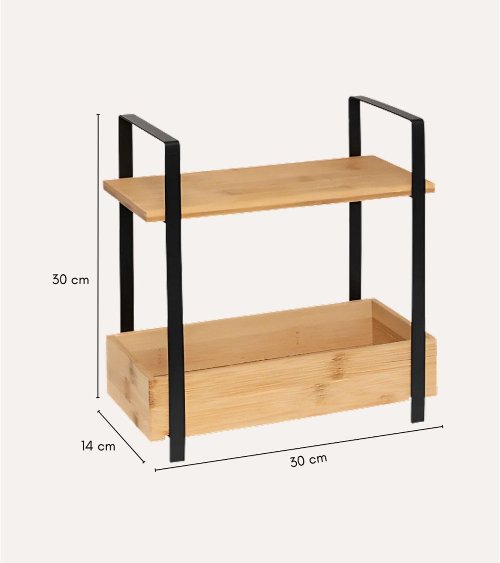 - Estructura: Dos niveles con diferentes alturas; el estante superior es más estrecho que el inferior, ideal para almacenar artículos más grandes.