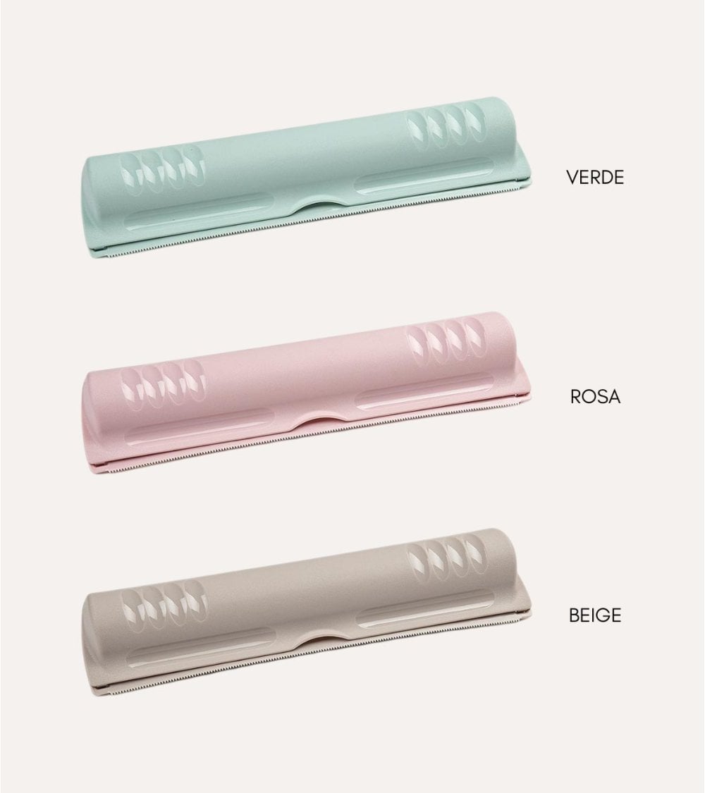 Cada portarrollo cuenta con un área texturizada con patrones circulares elevados que mejoran el agarre y evitan resbalones durante su uso. Además, presentan un diseño con cortes alargados a lo largo del cuerpo, facilitando la dispensación del papel y aportando un detalle estético distintivo.