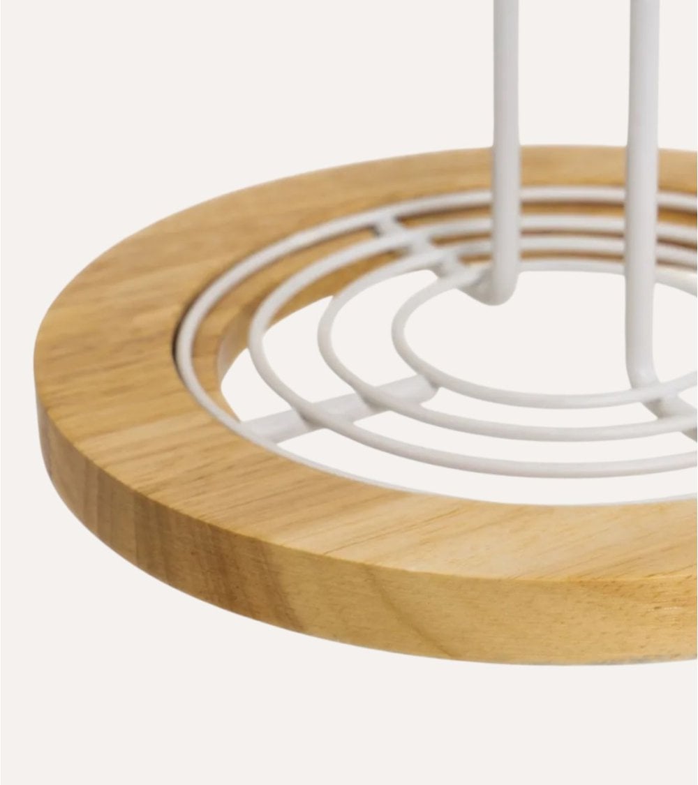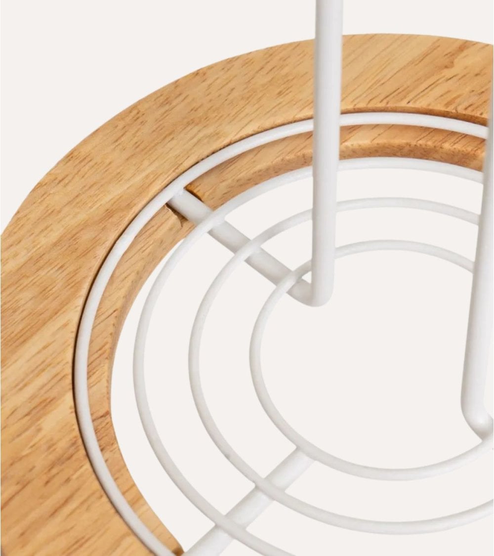 Diseñado por Casa Selección, este portarrollos destaca por su diseño moderno y funcionalidad. Su base circular está fabricada en madera natural pulida, que aporta estabilidad y un toque orgánico gracias a su textura visible. La estructura vertical es un poste de hierro pintado en blanco, que no solo garantiza durabilidad sino también un acabado contemporáneo que se integra perfectamente en cocinas o comedores con estilos modernos o escandinavos.