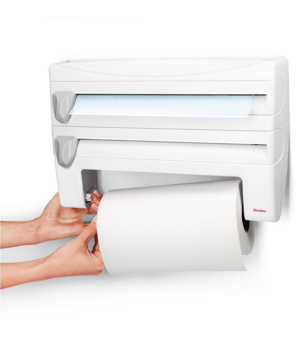 Un dispensador de rollos de cocina, diseñado para tener ordenados el papel de aluminio, el film para alimentos y el papel de cocina, siempre a mano y listos para usar. Incluye dos cuchillas deslizantes, ergonómicas y seguras, que facilitan el corte. Además de un espacio adicional en la parte superior para colocar botes de especias o un rollo de recambio.