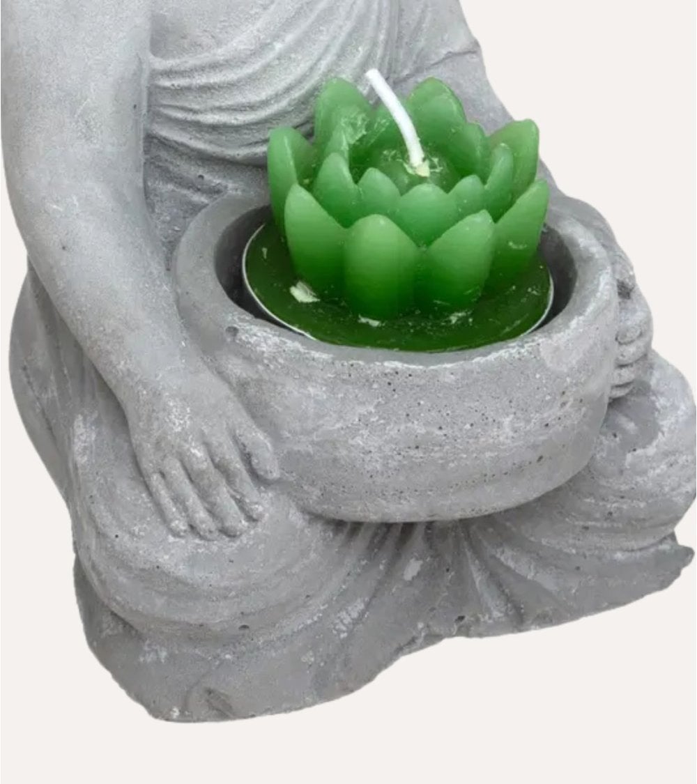 Su diseño detallado refleja la serenidad del Buda con rasgos faciales delicados, ojos semicerrados y una sonrisa suave que invita a la calma. Además, sostiene un portavelas con forma de loto verde, símbolo universal de pureza y renacimiento, que añade un contraste vibrante al tono grisáceo del cemento. Este portavelas es ideal para colocar una vela pequeña que ilumine suavemente el entorno, creando una atmósfera relajante perfecta para momentos de meditación o descanso.