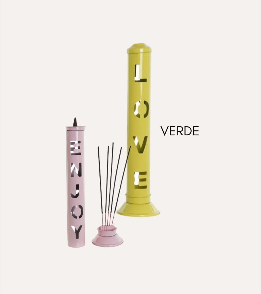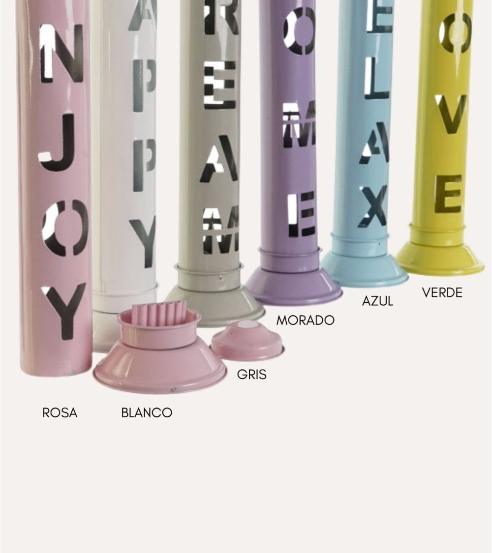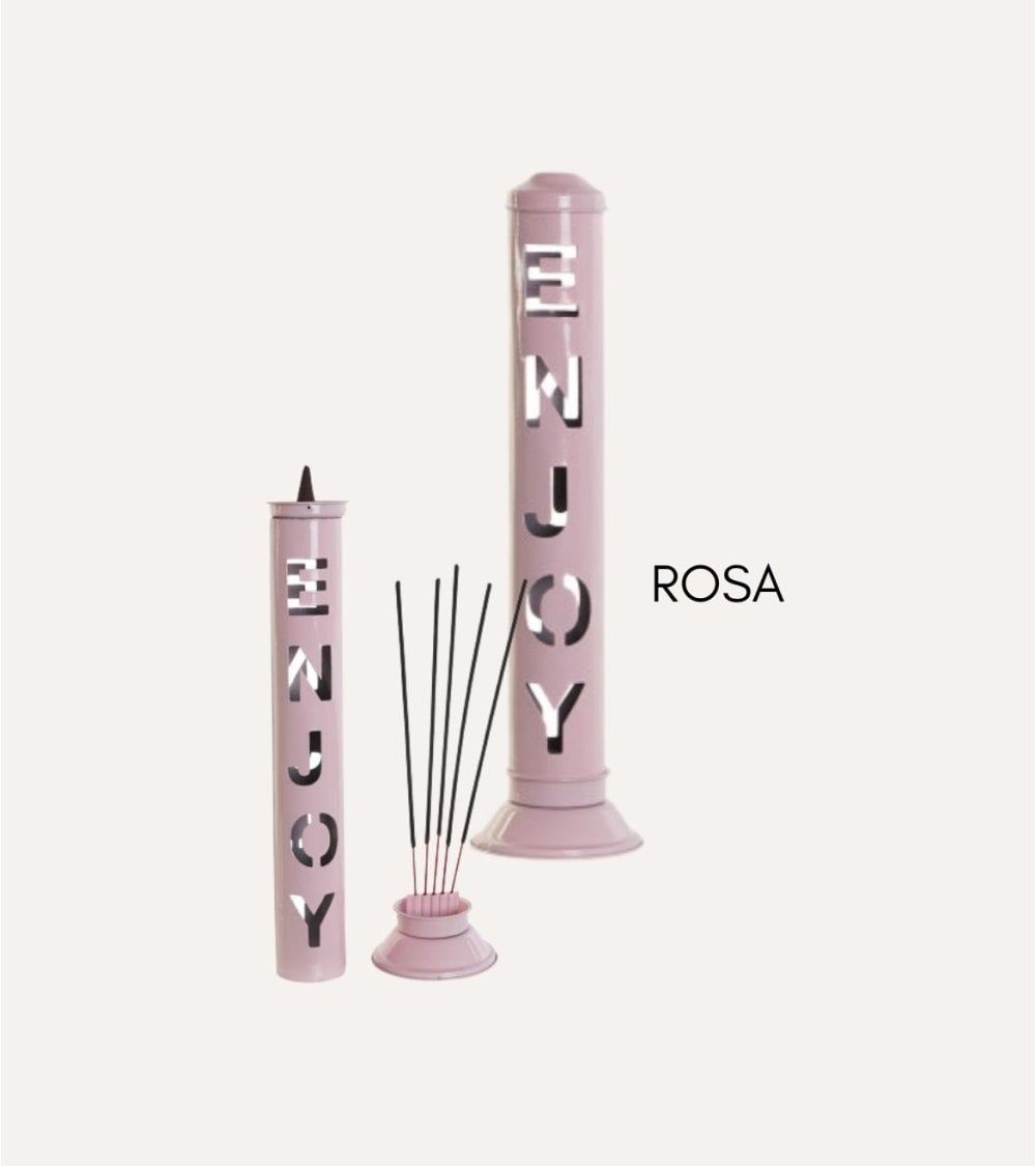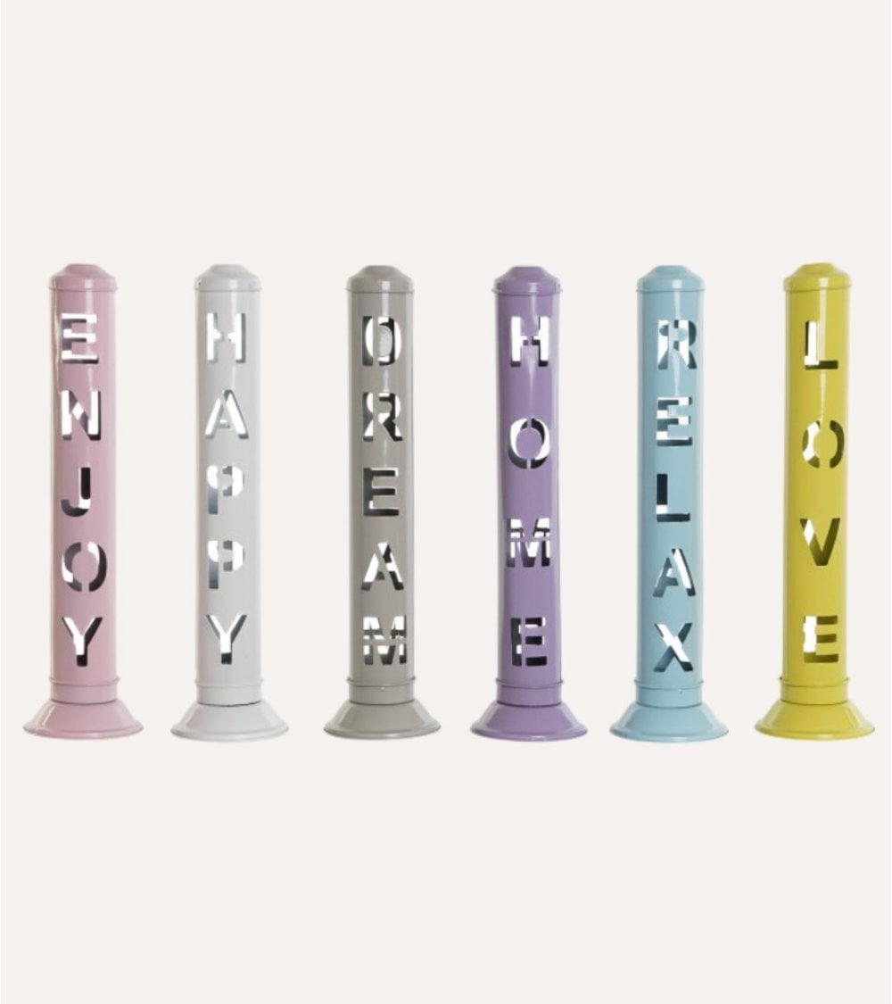 Estos portaincienso Enjoy de metal son prácticos y aportan un toque decorativo a tu hogar o espacio de bienestar. Con palabras inspiradoras como ENJOY, HAPPY, DREAM, HOME, RELAX y LOVE cortadas verticalmente, crean un ambiente acogedor y relajante. Su diseño moderno, alto y delgado, con una base ligeramente ensanchada, garantiza estabilidad. Disponibles en una paleta de colores pastel que incluye rosa, gris claro, lavanda, gris oscuro, azul claro y amarillo brillante. Fabricados en metal resistente con un acabado brillante que refleja la luz. Su tamaño ideal de 8 x 8 x 32 cm y su atractivo textural, con una superficie lisa y letras recortadas, ofrecen un contraste visual único.