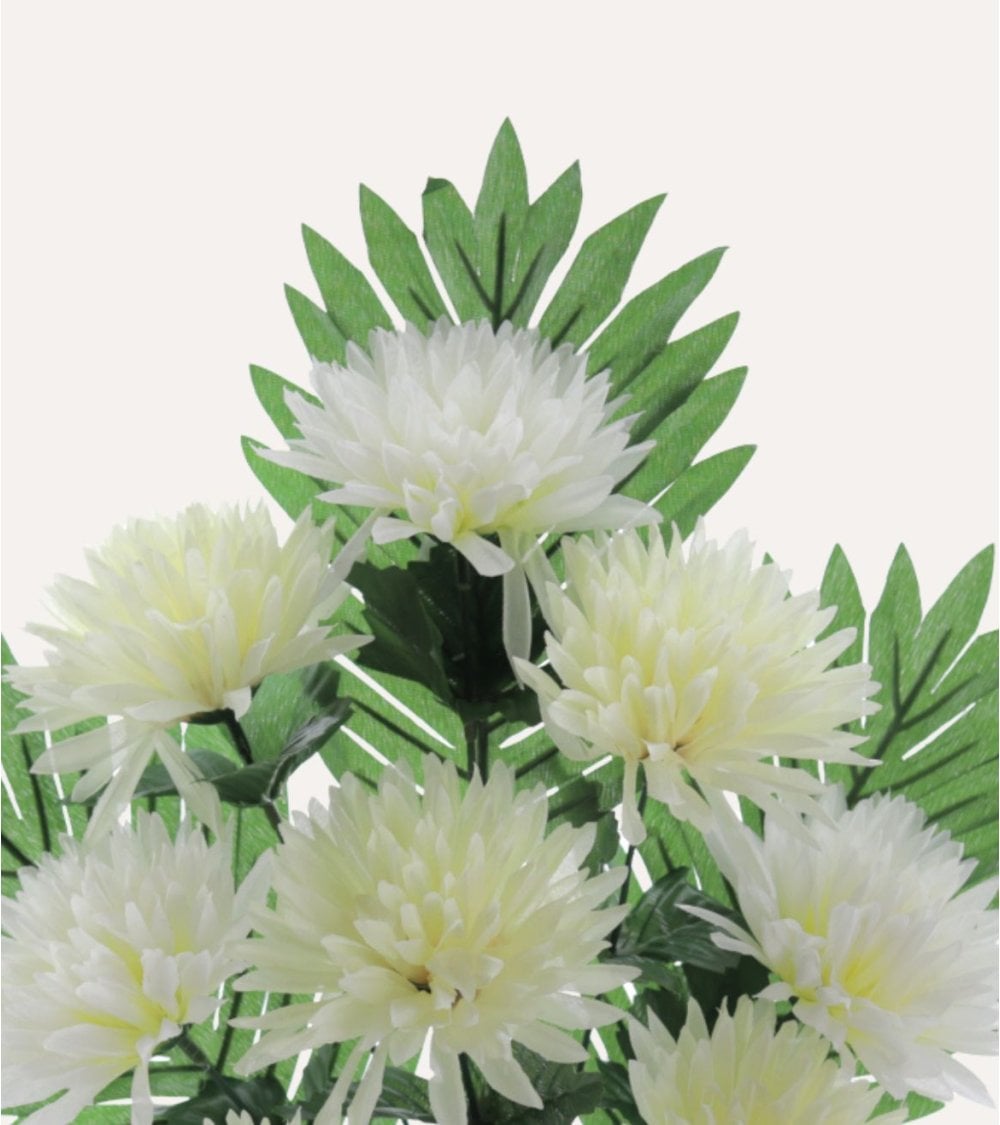 El diseño del ramo destaca por sus diez flores tipo crisantemo, con pétalos blancos que presentan un sutil degradado hacia un amarillo pálido en el centro, aportando profundidad y realismo. Cada flor tiene una textura delicada que imita fielmente la suavidad natural, gracias a su fabricación en materiales sintéticos de alta calidad. Además, las hojas verdes alargadas con bordes serrados complementan el conjunto, ofreciendo un contraste vibrante y una apariencia fresca.