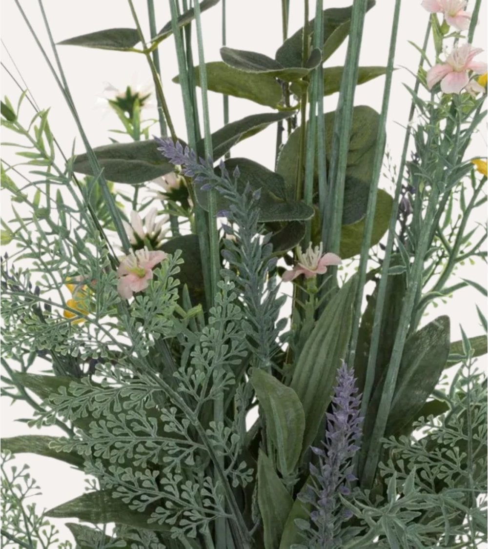 Gracias a su cuidada elaboración en plástico y poliéster de alta calidad, este ramo mantiene una apariencia realista y un tacto agradable, sin necesidad de riego ni mantenimiento. Podrás disfrutar de la belleza del eucalipto y de las flores silvestres durante todo el año, sin preocuparte por la luz, la temperatura o el paso del tiempo. Su estructura de tallos largos y flexibles permite adaptarlo fácilmente a diferentes jarrones y centros decorativos, logrando una presentación siempre armoniosa.
