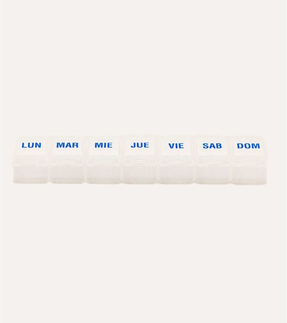 Este organizador semanal está diseñado con un cuerpo rectangular compacto que mide 15.2 x 1.8 cm, ideal para llevarlo en el bolso o guardarlo en casa sin ocupar mucho espacio. Su estructura está elaborada en plástico transparente resistente, lo que permite visualizar fácilmente el contenido sin necesidad de abrir cada compartimento.