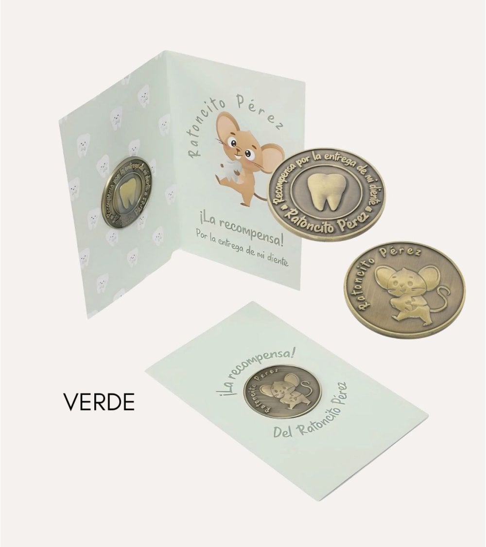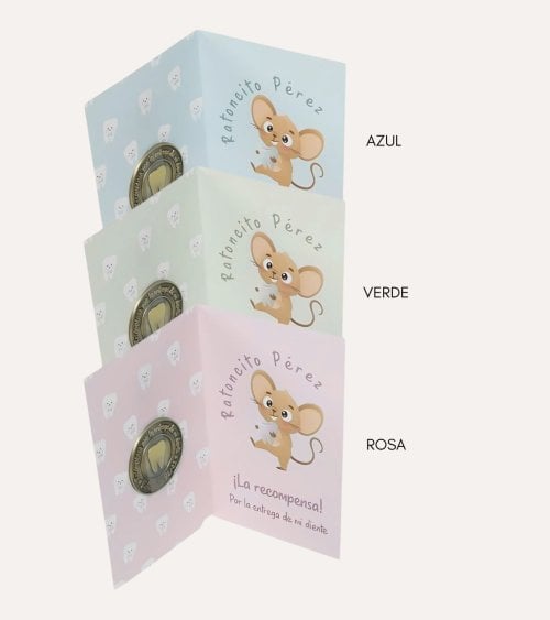La Moneda de Ratoncito Pérez con Tarjeta es un regalo mágico y único que hará que la pérdida de un diente sea un evento emocionante y memorable para los niños. Esta moneda temática del ratoncito Pérez es reversible y viene dentro de una tarjeta de color azul, verde o rosa.