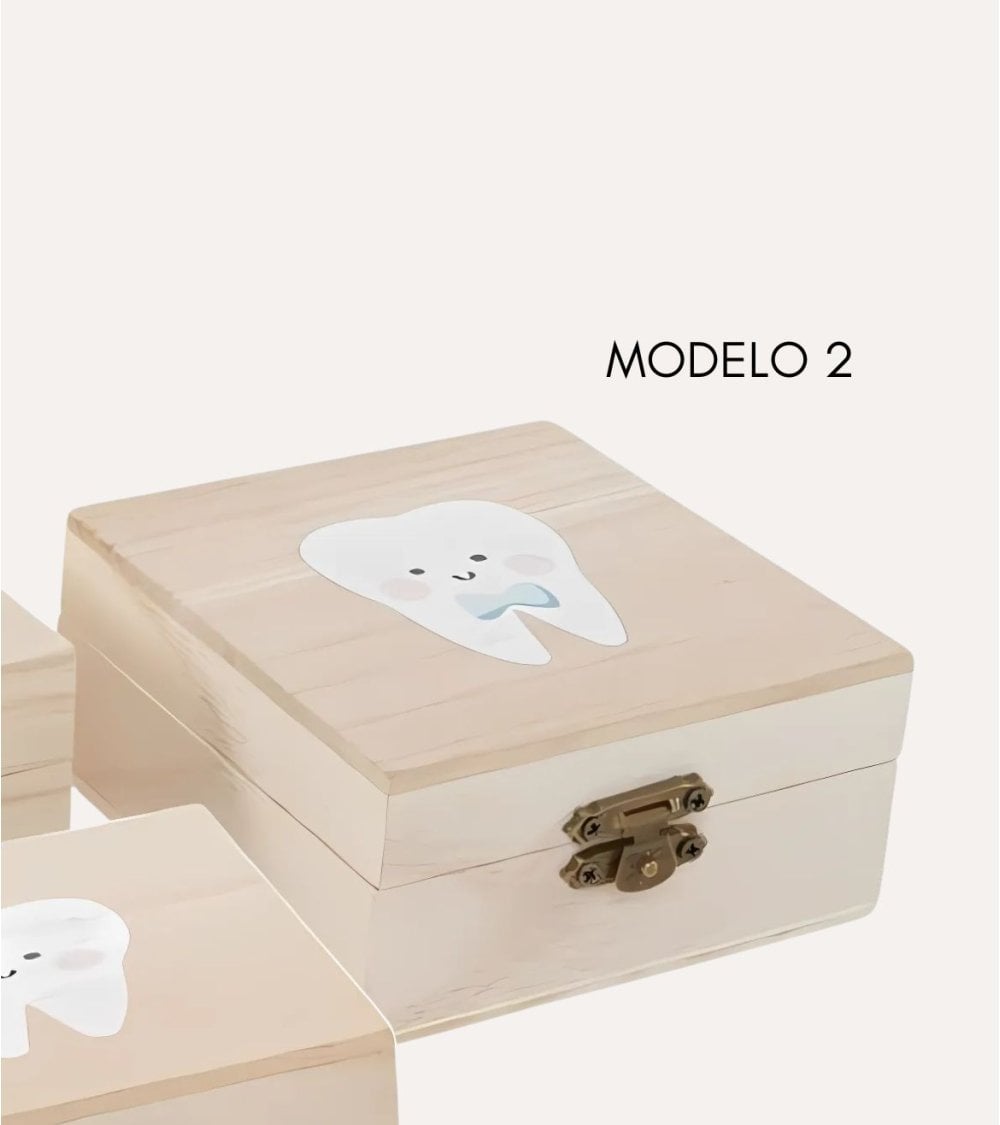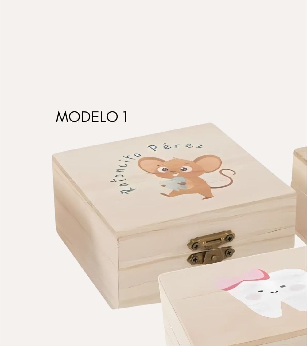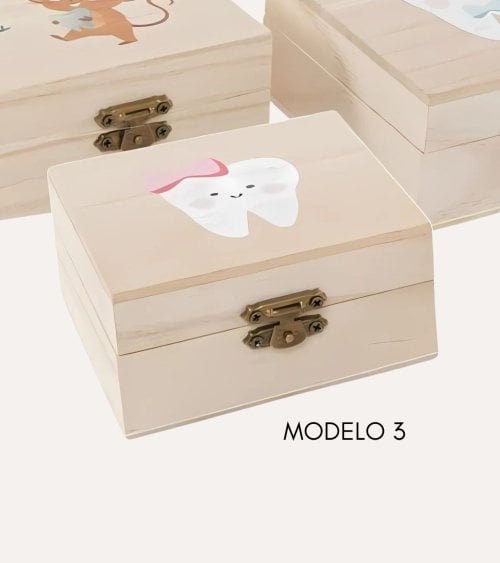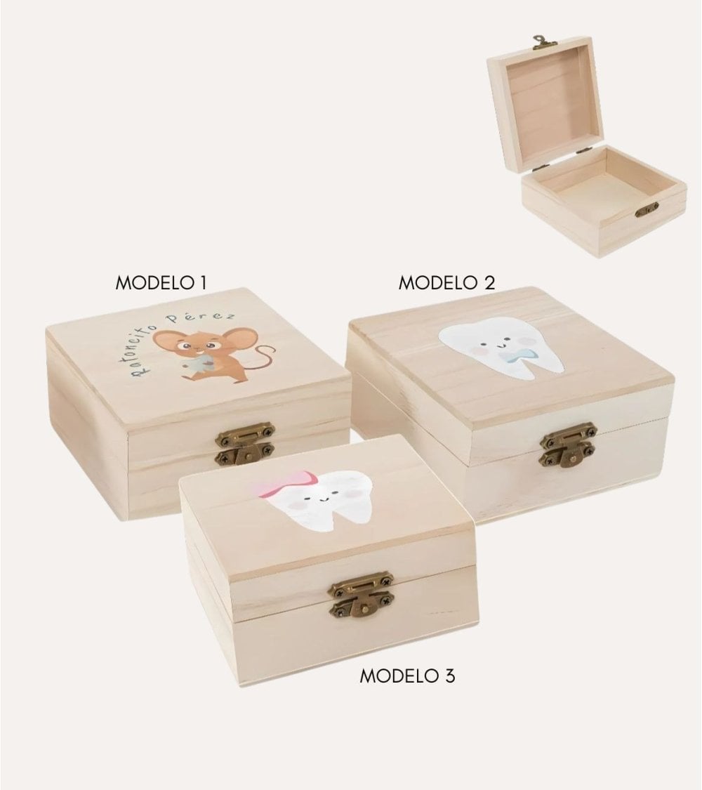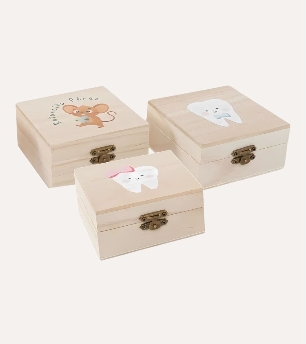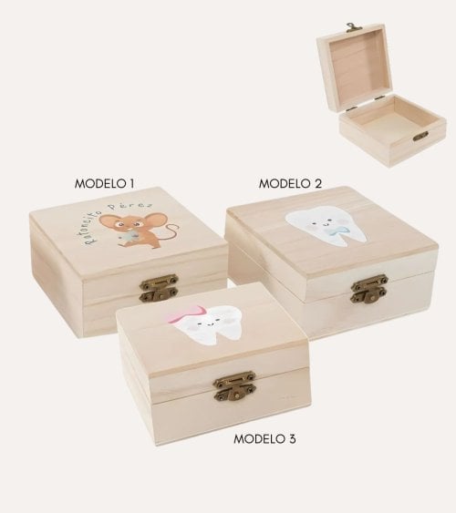 Esta cajita de madera para dientes es perfecta para guardar los dientes de leche de tus hijos. Disponible en 3 modelos encantadores: ratón perez, diente con lazo y diente con corbatin. Con unas medidas de 10 x 10 x 5 cm, es el tamaño ideal para guardar esos pequeños tesoros. Un regalo único y especial para los más pequeños.