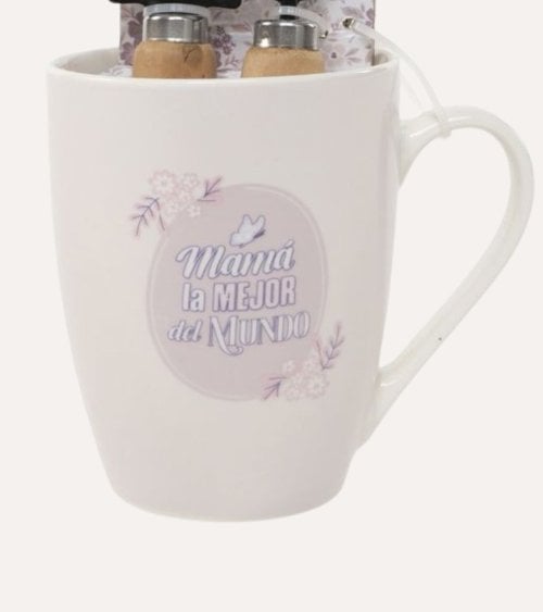 La taza presenta un diseño encantador con la frase "Mamá la MEJOR del Mundo", rodeada de delicados motivos florales en tonos pastel como lavanda y rosa. Este detalle no solo añade un toque personal, sino que también hace que el set sea una opción ideal para ocasiones especiales como el Día de la Madre.