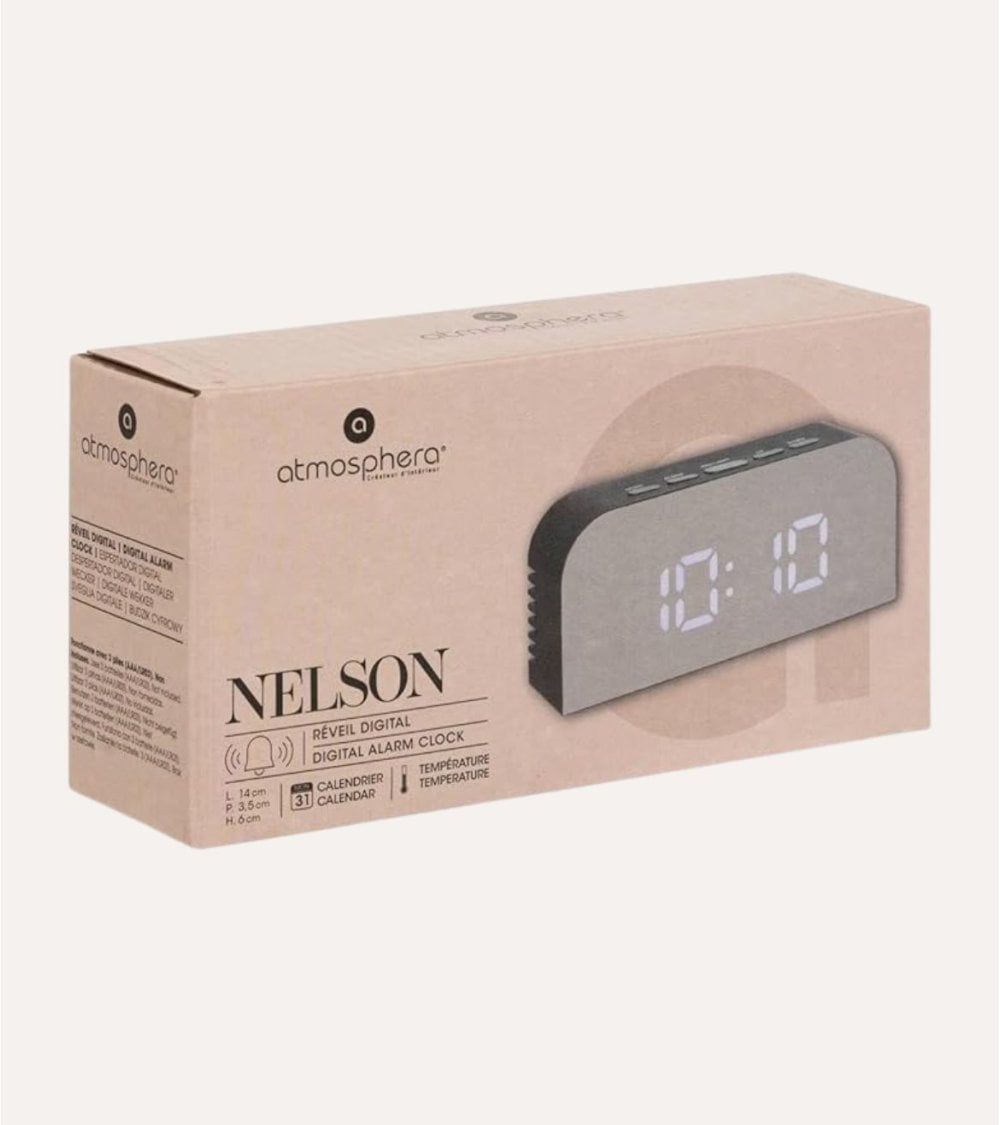 Descubre el Reloj Despertador Digital Nelson de PVC, un accesorio moderno y funcional que se adapta perfectamente a cualquier espacio. Con su diseño rectangular y bordes redondeados, este reloj no solo es práctico, sino que también añade un toque contemporáneo a tu dormitorio o oficina.