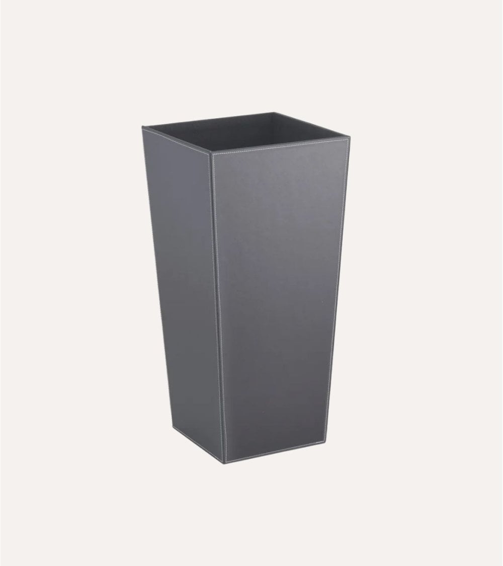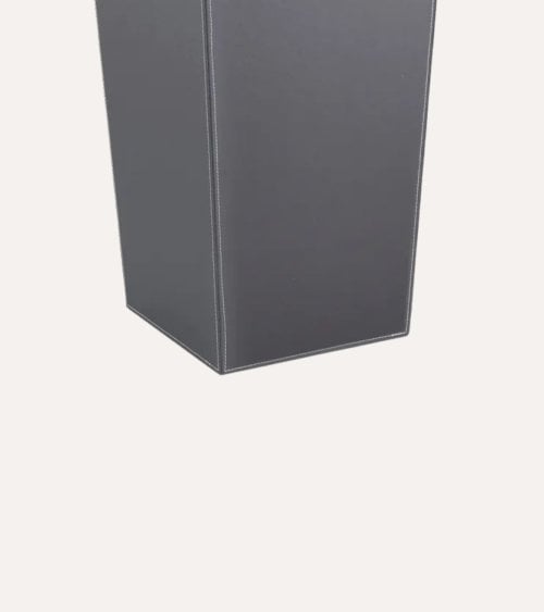 Este paragüero destaca por su acabado en efecto cuero, que aporta una textura visual atractiva y una sensación táctil suave, logrando un equilibrio perfecto entre elegancia y resistencia. Su estructura está elaborada con materiales de alta calidad: poliéster para el revestimiento exterior y MDF en la base, garantizando durabilidad y estabilidad.