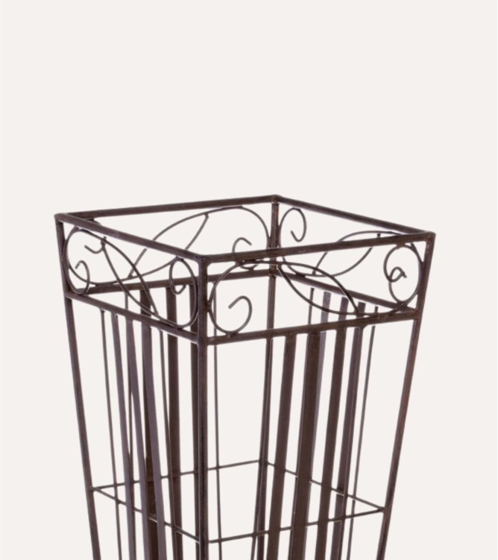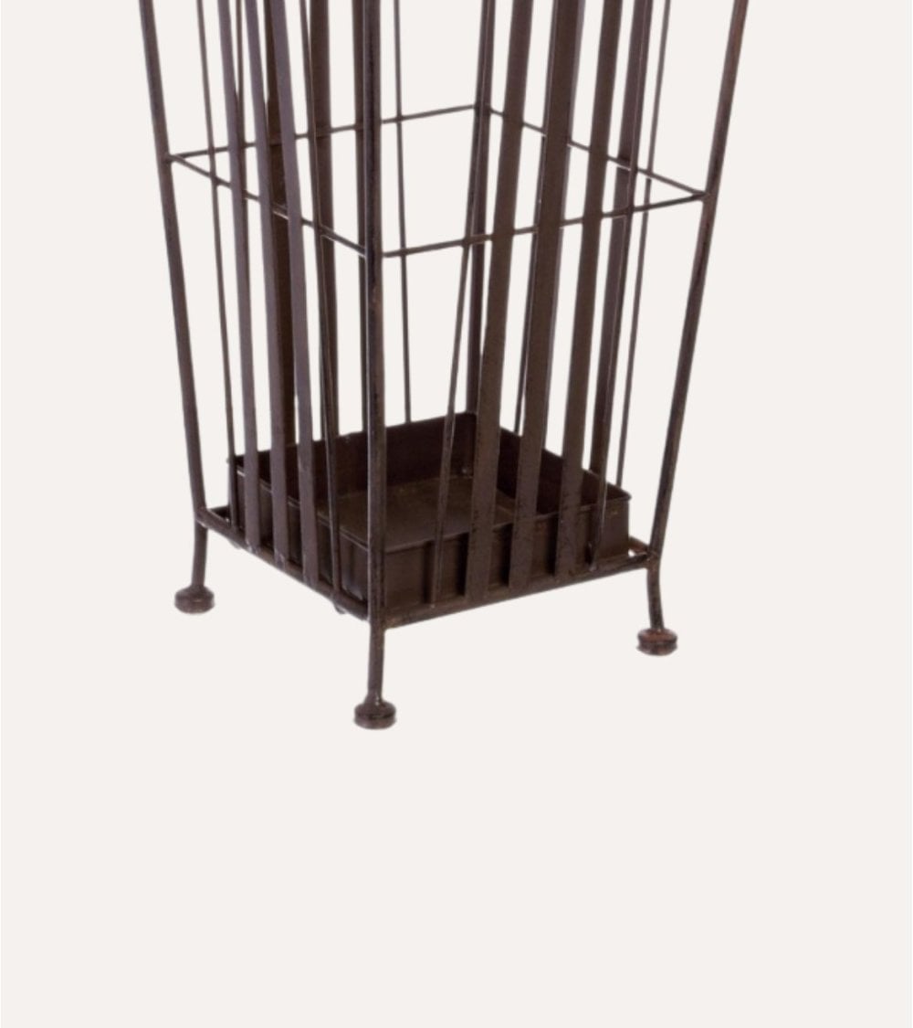 Gracias a su acabado en metal de tono oscuro, este paragüero se integra fácilmente en ambientes modernos, clásicos o industriales. Su forma rectangular, ligeramente más ancha en la base, asegura estabilidad incluso cuando está lleno, evitando vuelcos accidentales. El diseño abierto con barrotes permite que el aire circule, ayudando a secar los paraguas mojados y evitando la acumulación de humedad en el interior.