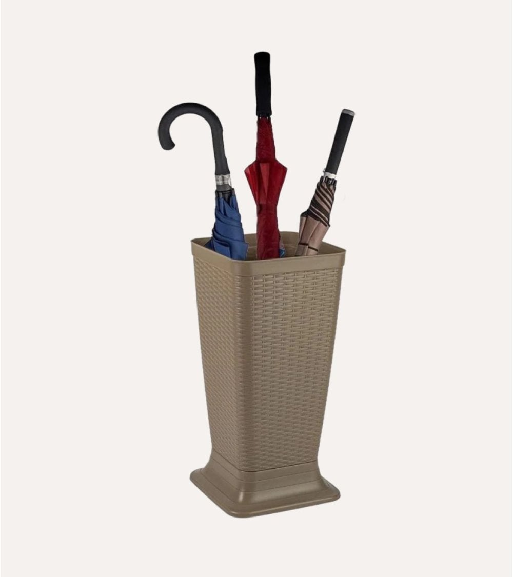 - Material: El paragüero está fabricado con plástico de alta calidad con un diseño de ratán, lo que garantiza su resistencia y durabilidad.