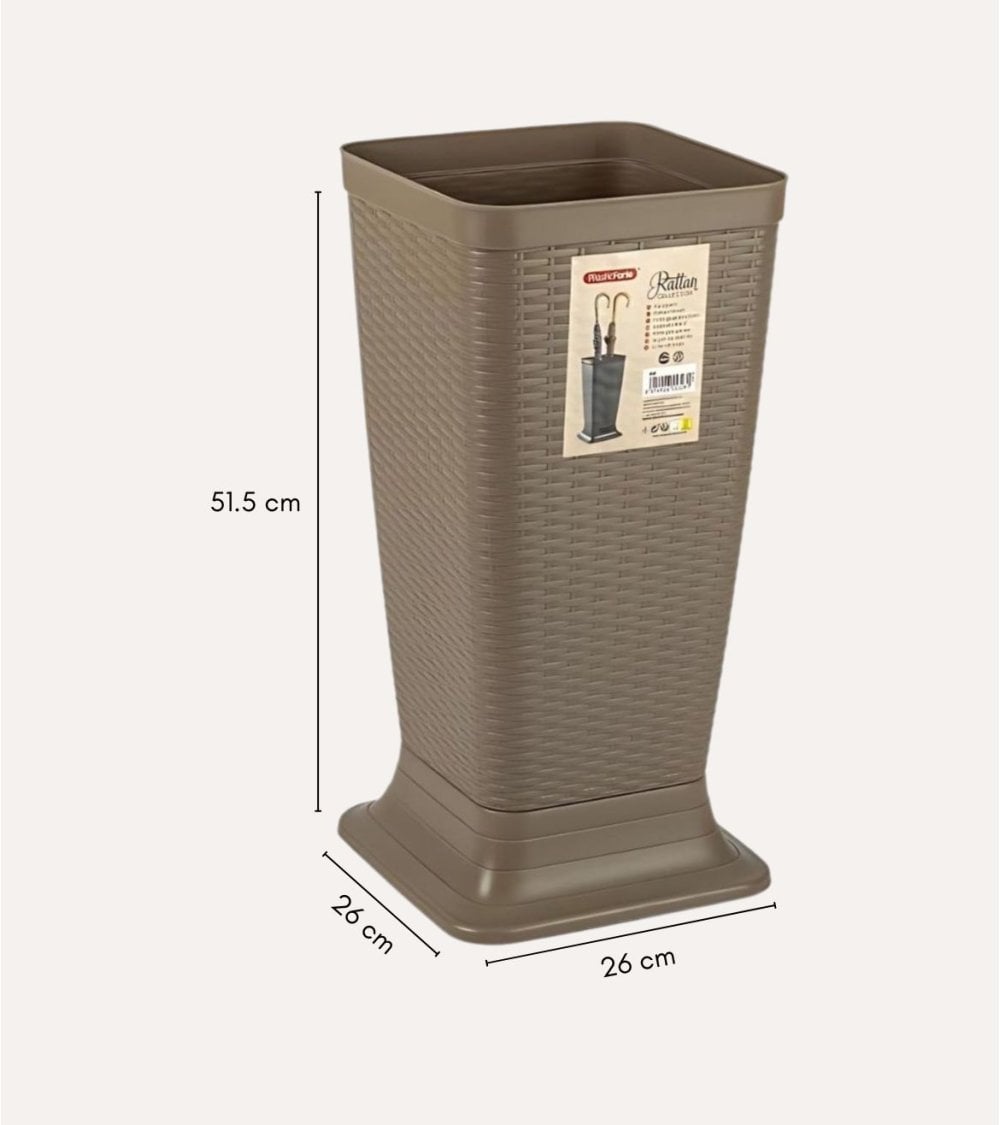 El Paragüero Rattan de Plástico es un accesorio elegante y funcional para tu hogar. Fabricado en plástico con un sofisticado diseño de ratán, este paragüero de color topo o blanco se adapta a cualquier decoración. Sus medidas son 51.5 x 26 x 26 cm, lo que lo hace ideal para guardar tus paraguas de manera ordenada y estilizada.