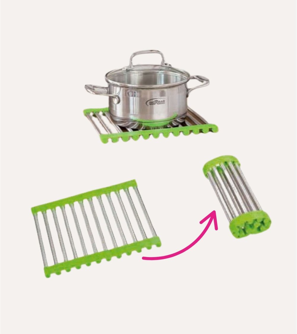 Este salvamanteles es perfecto para quienes buscan una solución duradera y fácil de almacenar. Su diseño enrollable permite guardarlo sin ocupar espacio, facilitando su uso diario y manteniendo tu cocina ordenada. Además, su estructura metálica garantiza una excelente resistencia al calor, protegiendo mesas y encimeras de ollas, sartenes o platos calientes.