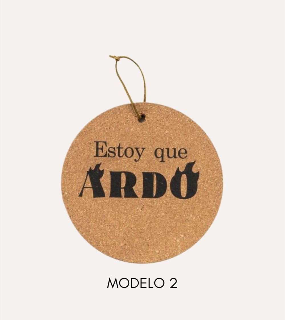 El reverso del salvamantel presenta otra frase ingeniosa: "Estoy que ÁRDO". Aquí, "ÁRDO" está adornado con acentos similares a llamas, reforzando el tema del calor. La impresión en negro sobre el fondo natural del corcho asegura que el mensaje sea claro y legible.