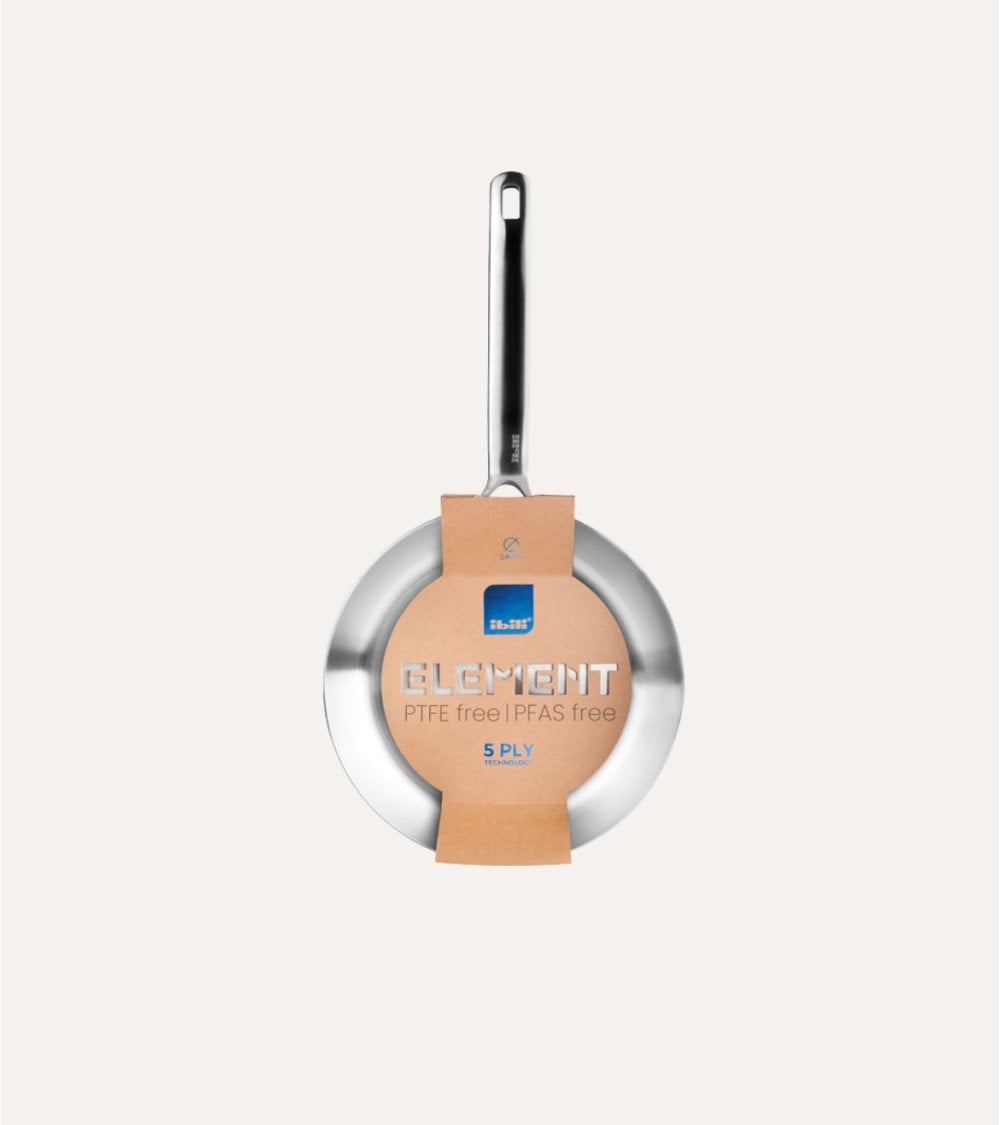 La sartén 5PLY Element está fabricada con cinco capas, integrando 2 capas de acero inoxidable 18/10 de alta calidad y 3 capas de aluminio con núcleo 3003. Esta combinación garantiza una distribución uniforme del calor, cocinando tus alimentos de manera eficiente. Su superficie pulida facilita la limpieza y su mango ergonómico ofrece un agarre seguro. Compatible con todo tipo de fuegos, sin recubrimientos químicos y apta para lavavajillas. Máxima eficiencia energética y resistencia a la corrosión y al desgaste diario.