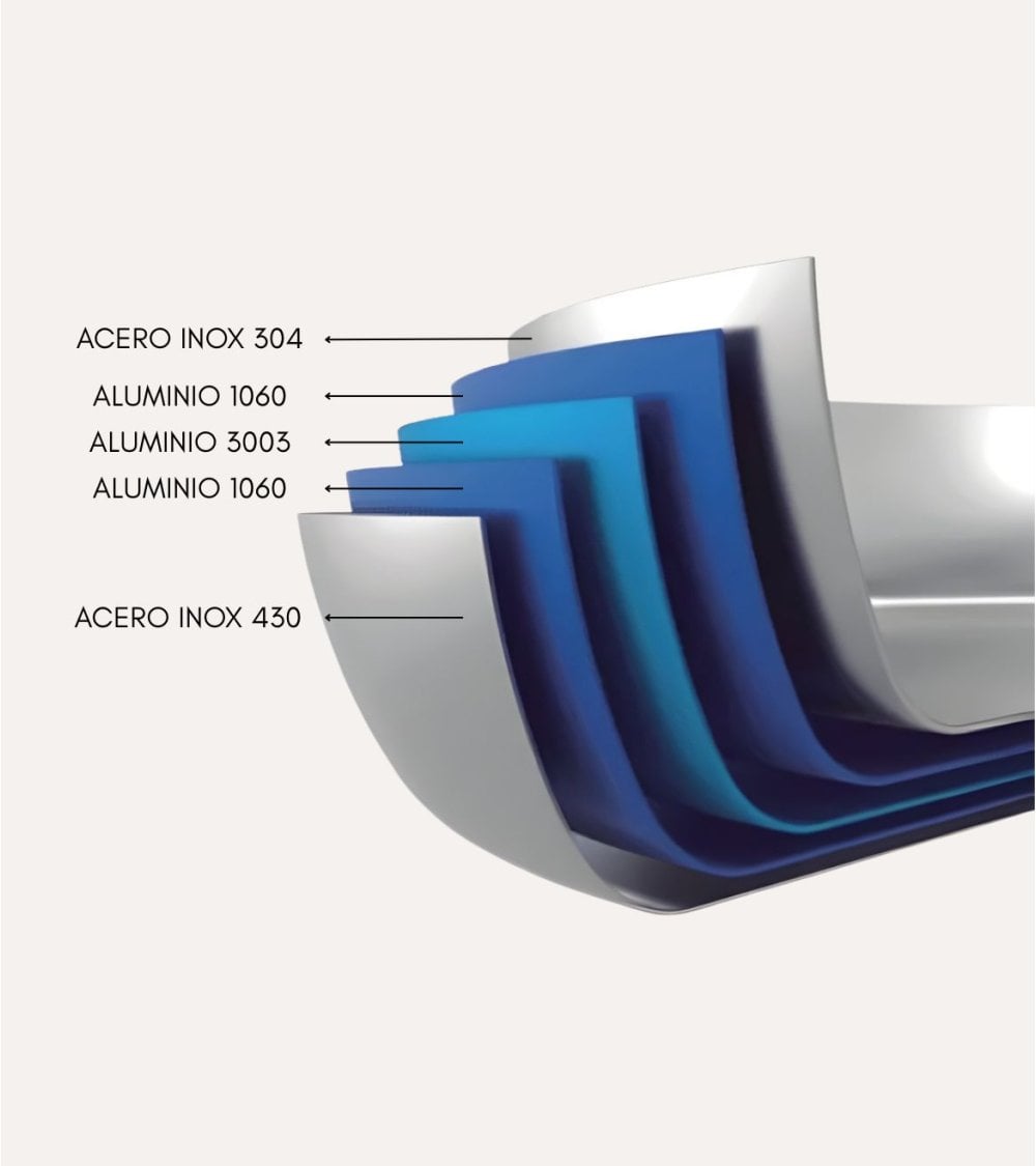 - Estructura de 5 capas (2 acero inoxidable 18/10 + 3 capas de aluminio con núcleo 3003) para una distribución del calor rápida y homogénea.