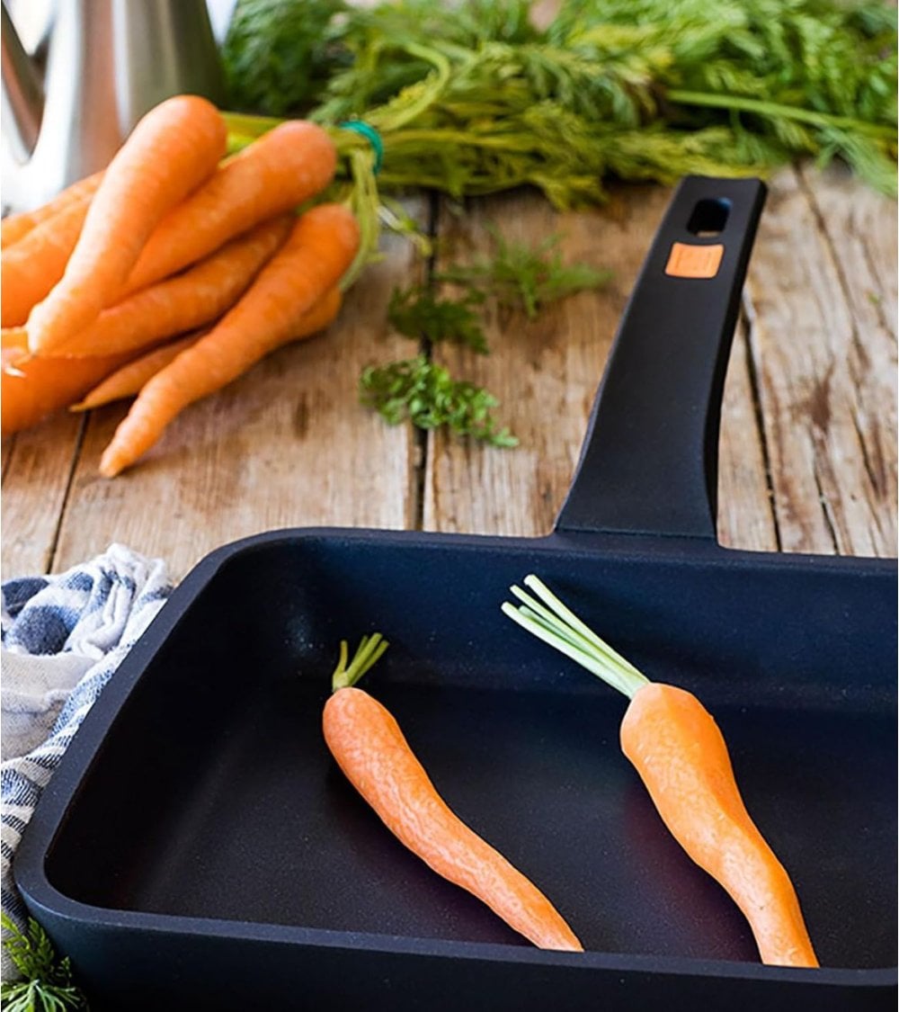 Disponible en dos tamaños prácticos: 22 cm y 28 cm, y en dos modelos distintos: Liso y con Rayas, esta sartén se adapta a diferentes necesidades culinarias. El modelo con rayas es perfecto para lograr esas marcas características del grill, aportando sabor y estética a carnes, verduras y más.