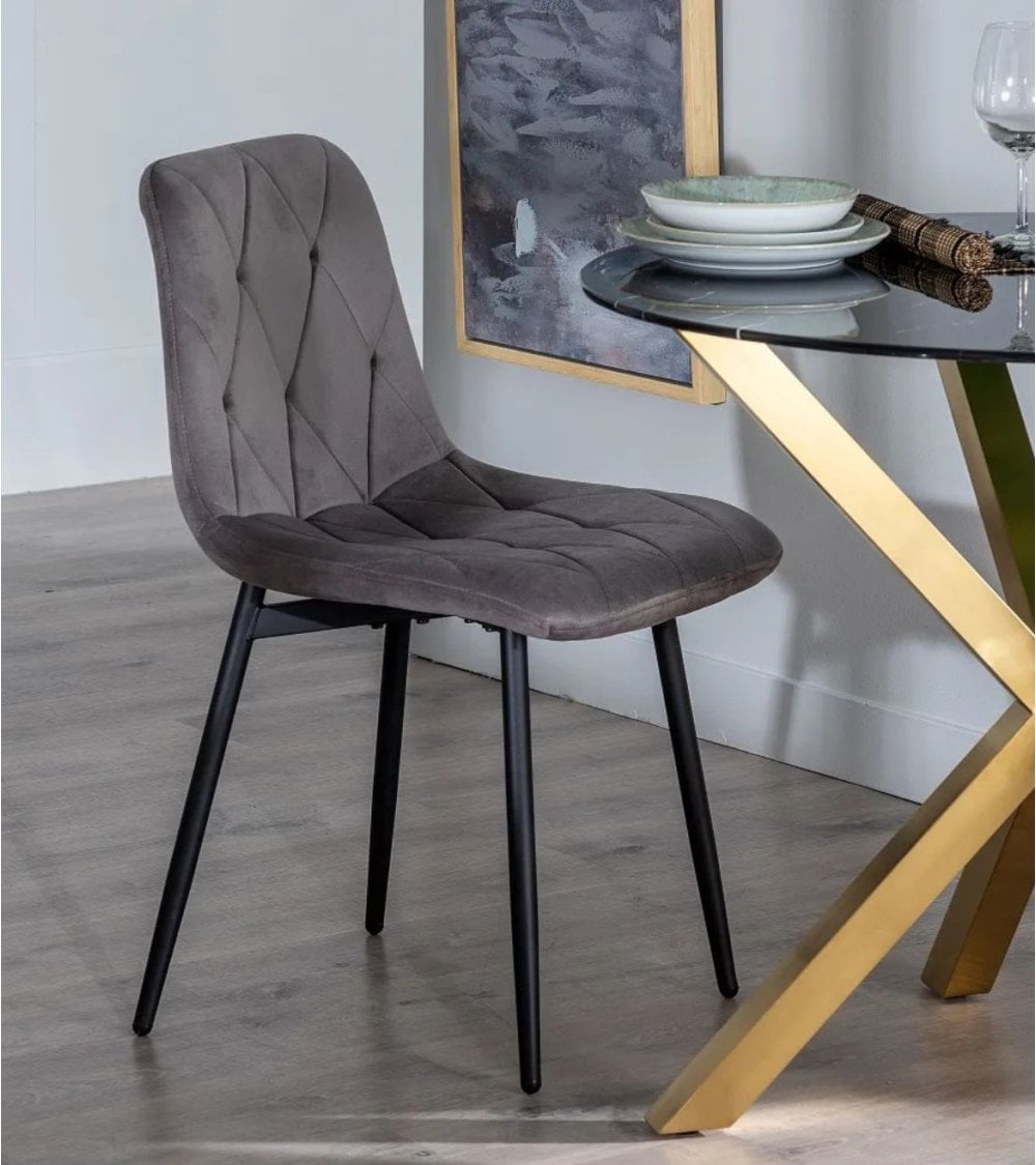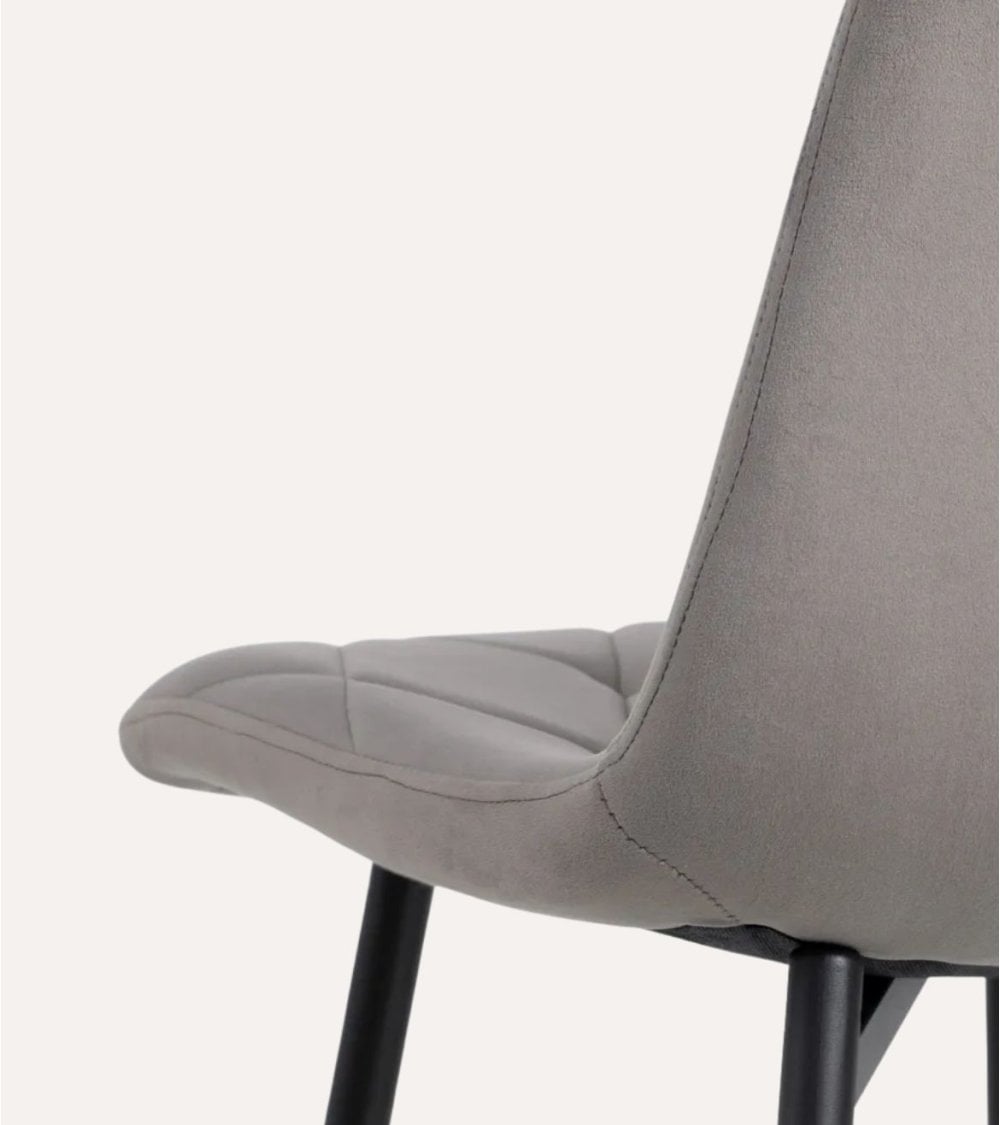 El respaldo presenta un diseño ligeramente curvado que ofrece soporte ergonómico, mientras que el patrón de capitoné en forma de diamante añade un toque distintivo y elegante. La base cuenta con cuatro patas metálicas negras mate, delgadas pero robustas, que se estrechan hacia abajo para aportar ligereza visual sin perder firmeza.