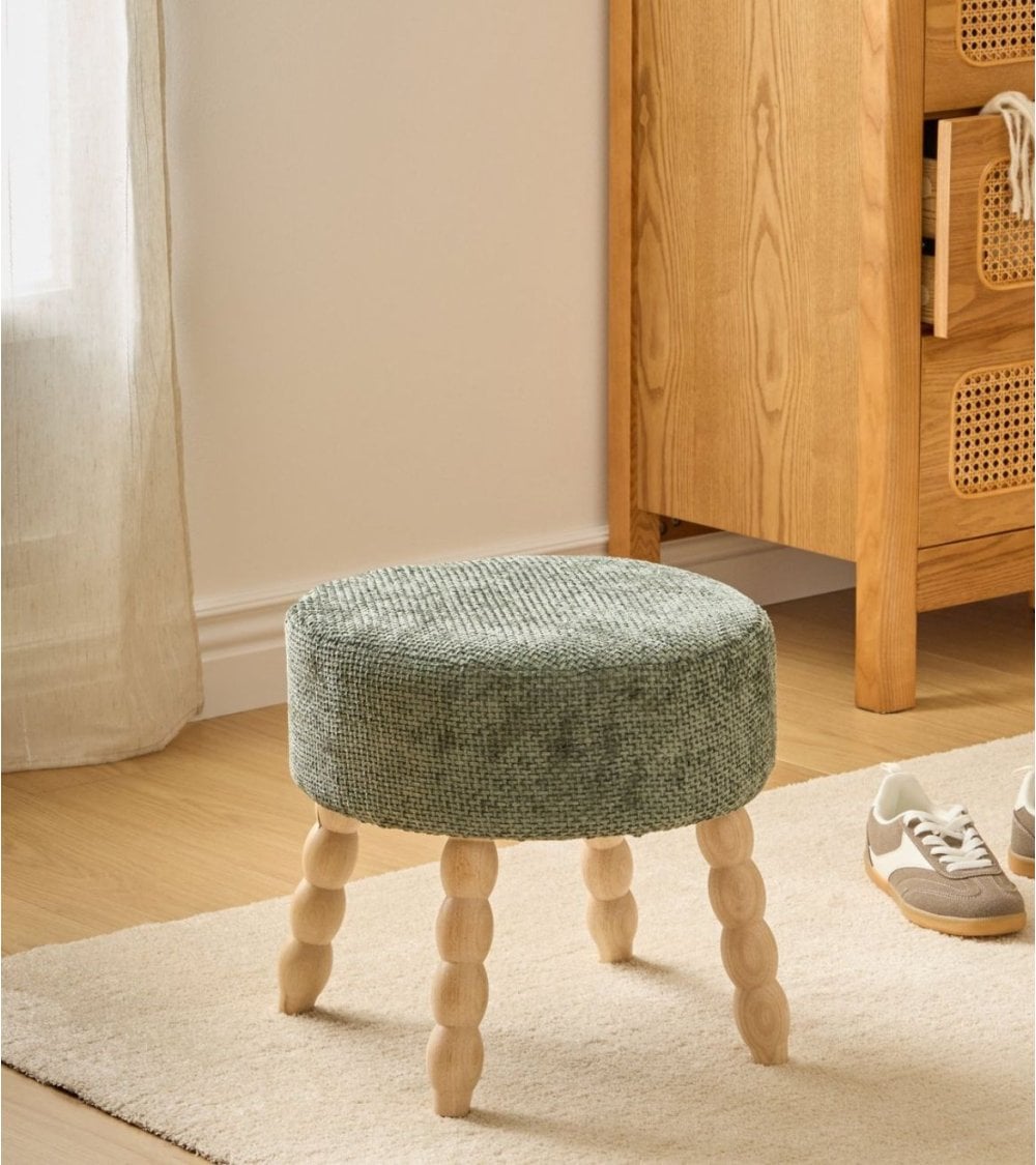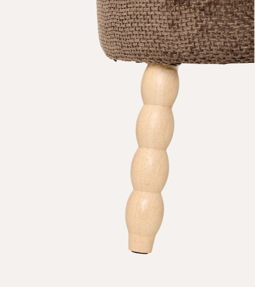 Su diseño contemporáneo destaca por un asiento redondo tapizado en chenilla, disponible en tres colores sofisticados: Verde, Blanco y Marrón. La textura tejida del poliéster aporta un toque cálido y acogedor, mientras que sus patas de madera clara con acabado natural ofrecen estabilidad y un estilo único gracias a su forma redondeada tipo bobbin.