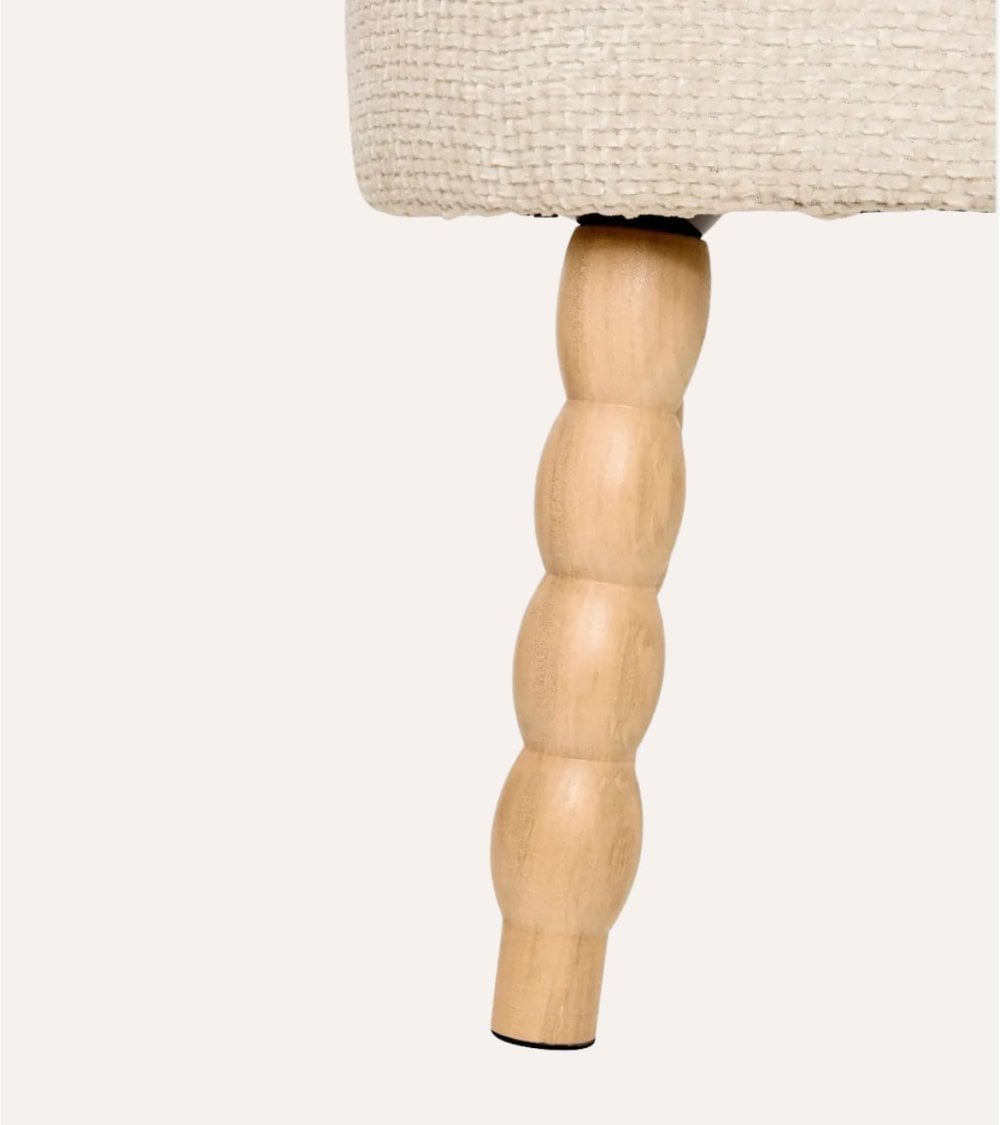 Su diseño contemporáneo destaca por un asiento redondo tapizado en chenilla, disponible en tres colores sofisticados: Verde, Blanco y Marrón. La textura tejida del poliéster aporta un toque cálido y acogedor, mientras que sus patas de madera clara con acabado natural ofrecen estabilidad y un estilo único gracias a su forma redondeada tipo bobbin.