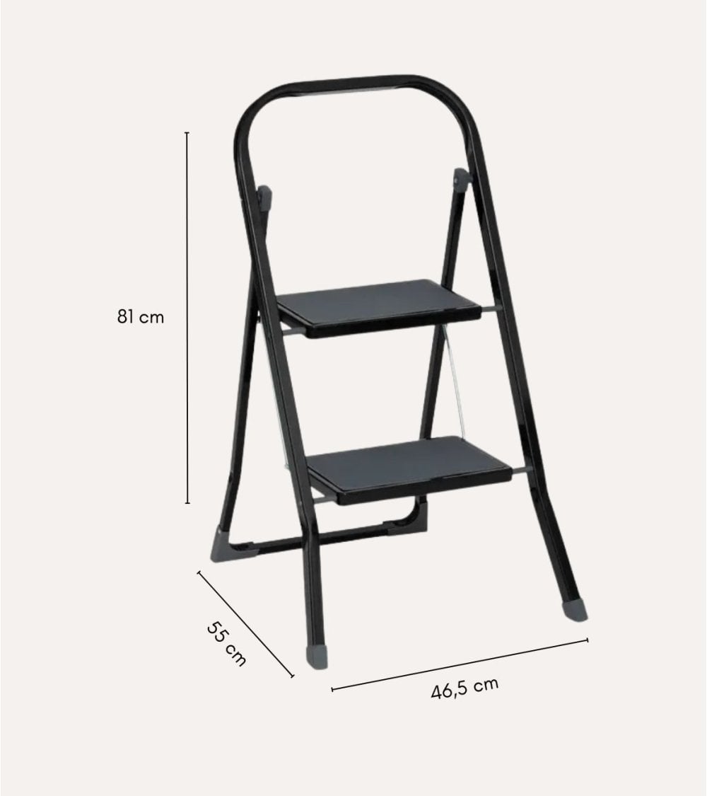 El diseño plegable permite guardarlo fácilmente en espacios reducidos cuando no está en uso, ideal para hogares con poco espacio o para transportarlo cómodamente. Además, cuenta con dos peldaños amplios y antideslizantes que proporcionan seguridad al subir o bajar.