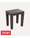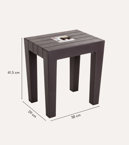 Características físicas: Con una estructura cuadrada y cuatro patas robustas, este taburete ofrece estabilidad y seguridad. Su superficie está diseñada con listones que no solo aportan un toque estético, sino que también facilitan el drenaje del agua, evitando la acumulación.