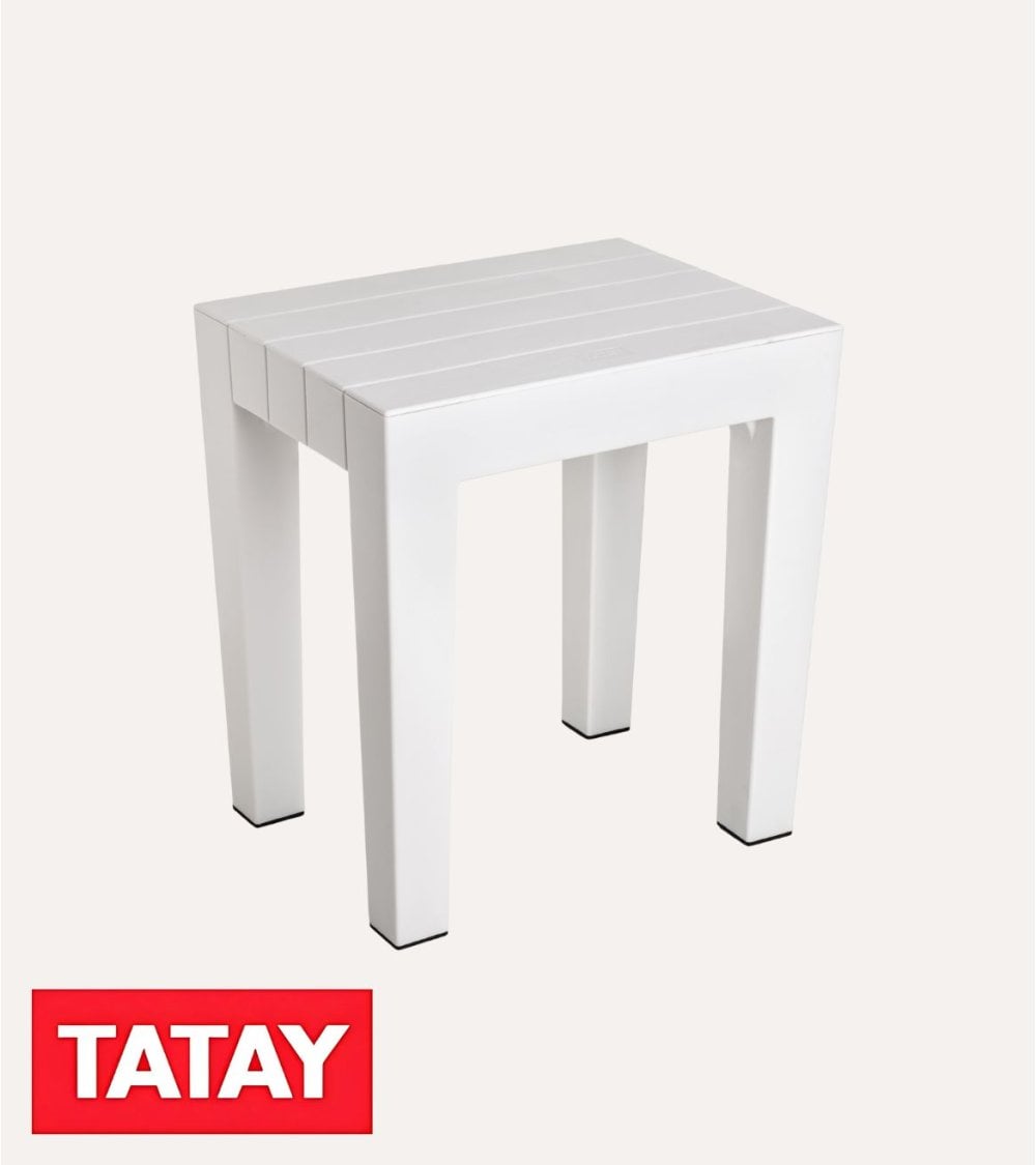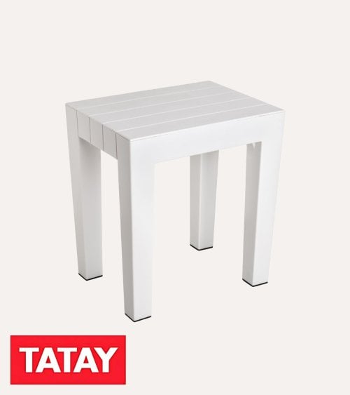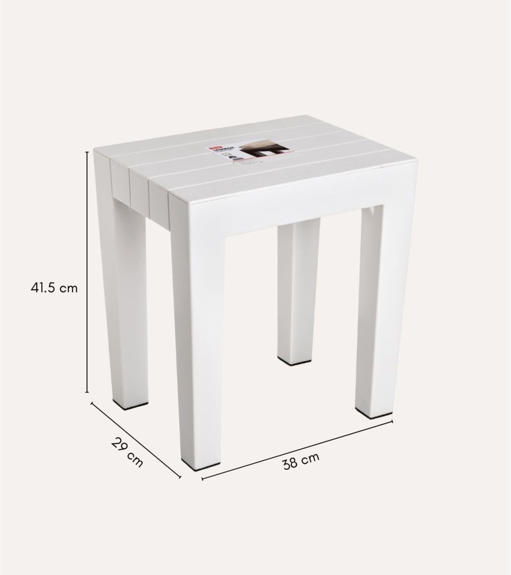 Características físicas: Con una estructura cuadrada y cuatro patas robustas, este taburete ofrece estabilidad y seguridad. Su superficie está diseñada con listones que no solo aportan un toque estético, sino que también facilitan el drenaje del agua, evitando la acumulación.
