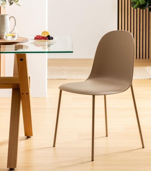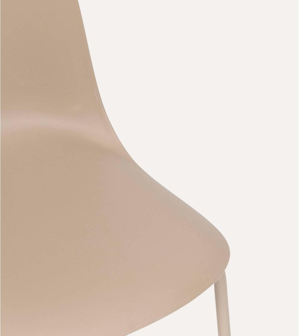 Su estructura está fabricada con polipropileno resistente, un material duradero y fácil de limpiar, perfecto para el uso diario. Las patas están hechas en acero con acabado en polvo, lo que garantiza estabilidad y una apariencia sofisticada. La combinación de estos materiales ofrece una silla ligera pero robusta, capaz de soportar el uso constante sin perder su estilo ni confort.