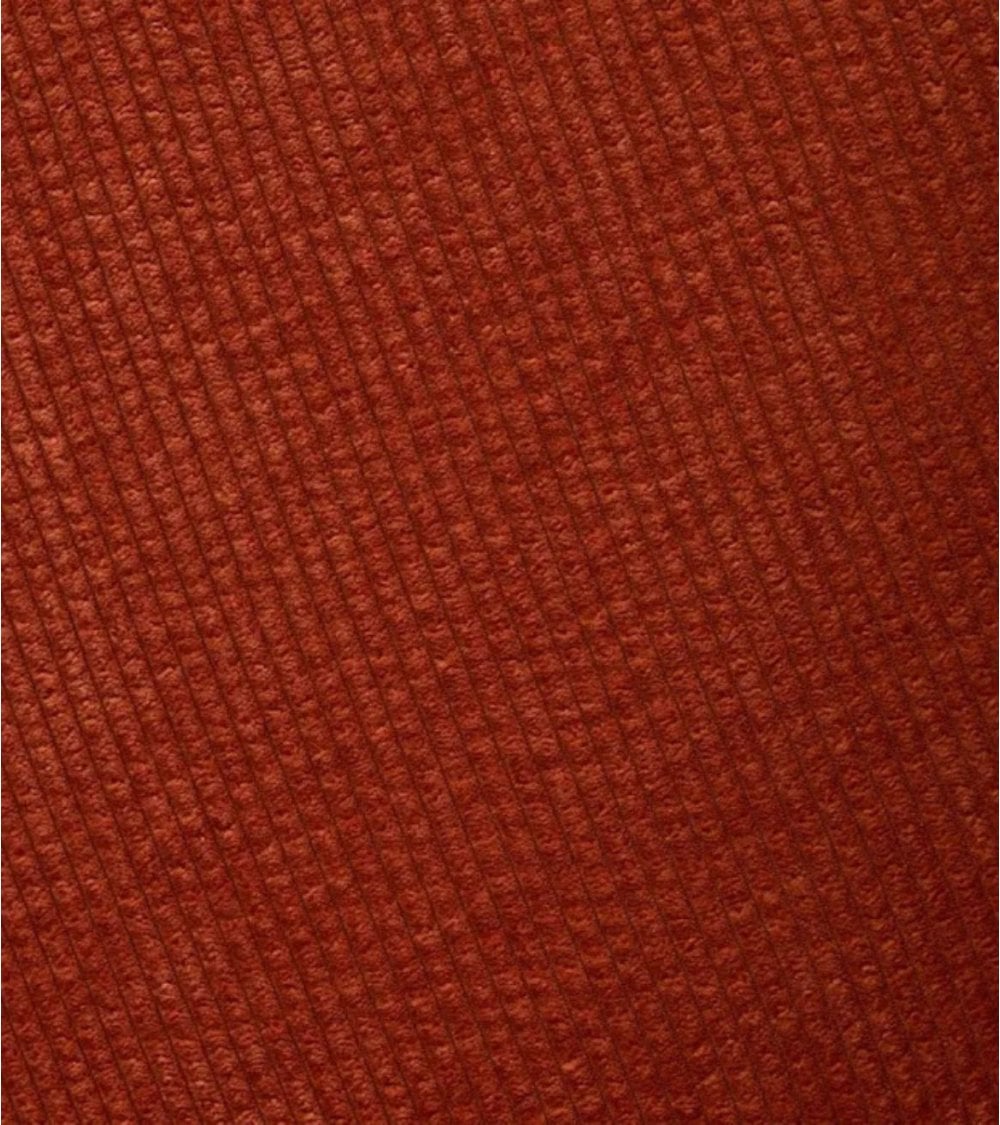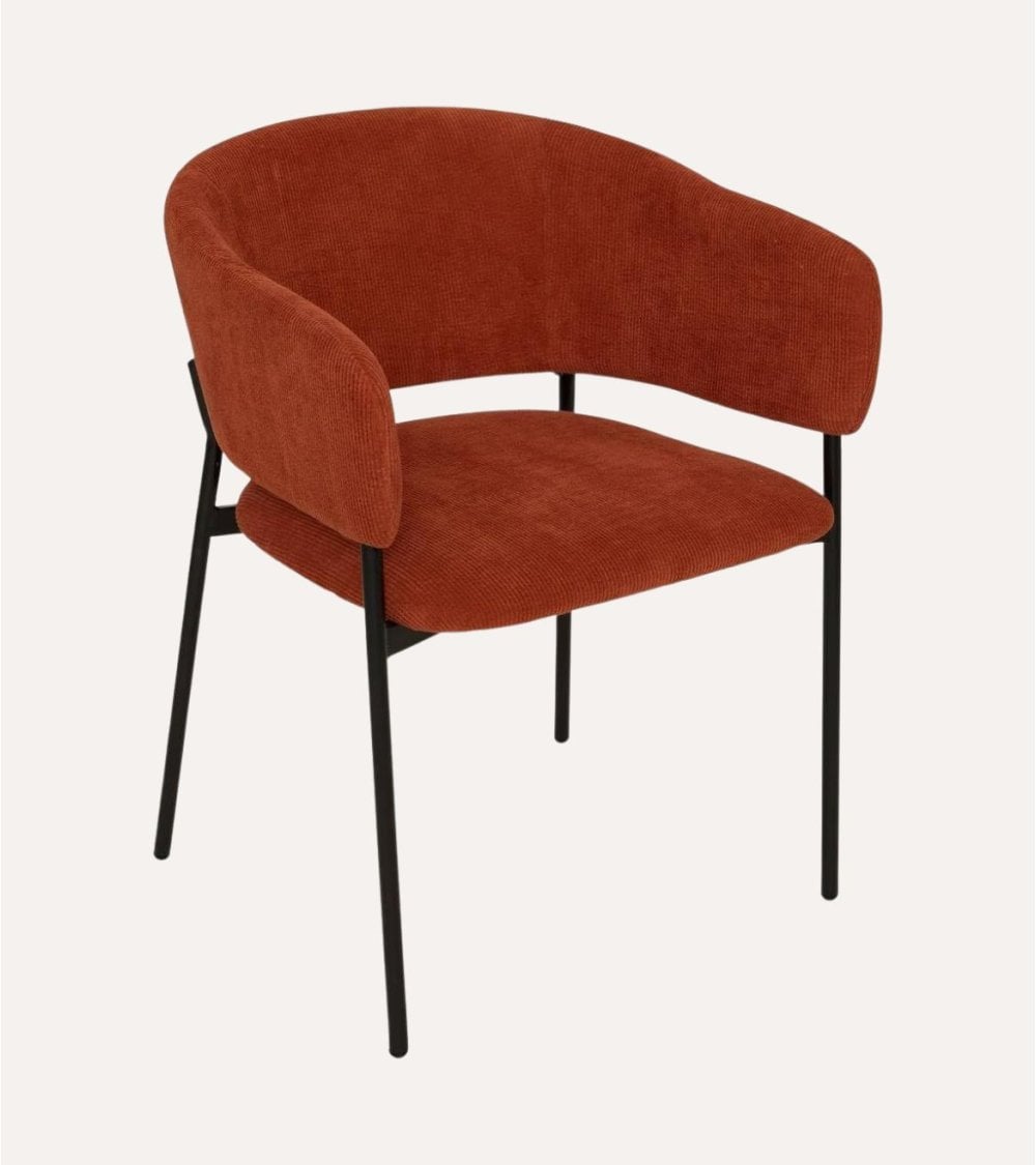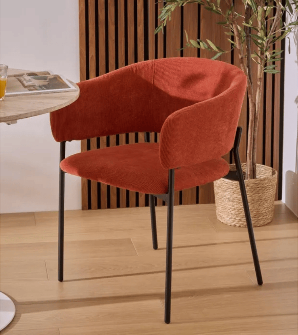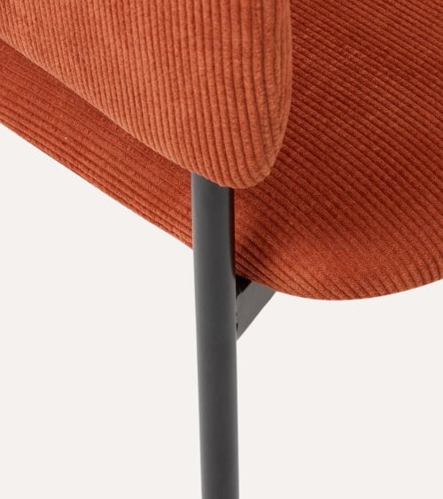 Su estructura está fabricada en acero resistente, garantizando durabilidad y estabilidad a largo plazo. El acabado en color negro mate aporta un toque moderno y elegante que se integra fácilmente con diferentes estilos decorativos. La tapicería en terciopelo acanelado de alta calidad ofrece una textura suave y acogedora, además de un color terracota profundo que añade calidez visual al ambiente.