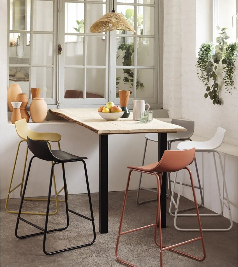 Aprovecha la combinación perfecta entre plástico resistente y metal sólido que ofrece este taburete alto. Su diseño escandinavo minimalista lo convierte en una opción práctica tanto para uso residencial como comercial. Además, la barra transversal funciona como reposapiés aportando confort adicional durante su uso prolongado.