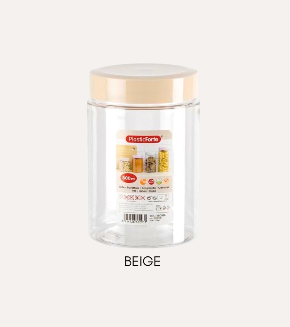Este bote está elaborado con plástico resistente, lo que garantiza ligereza sin sacrificar la robustez necesaria para un uso diario. Su cuerpo transparente permite visualizar fácilmente el contenido, facilitando la organización y control de tus alimentos secos como pasta, cereales, frutos secos o snacks.