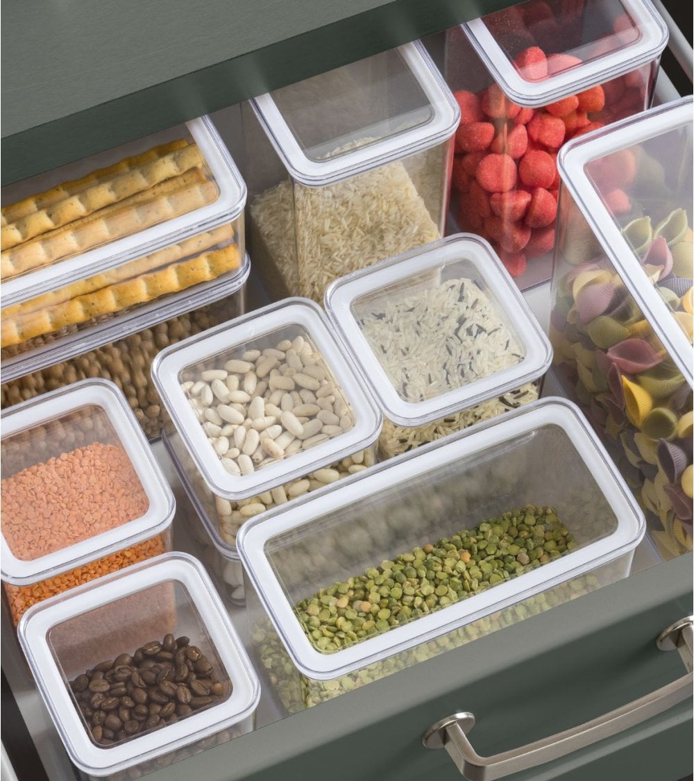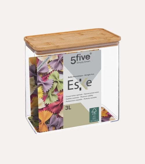 El Tarro Oslo está fabricado con un cuerpo de plástico claro, lo que permite ver fácilmente su contenido. Esto significa que no tendrás que abrir cada tarro para encontrar lo que buscas. La tapa, hecha de bambú, no solo aporta un toque natural, sino que también es resistente y ecológica.