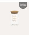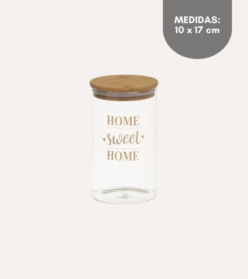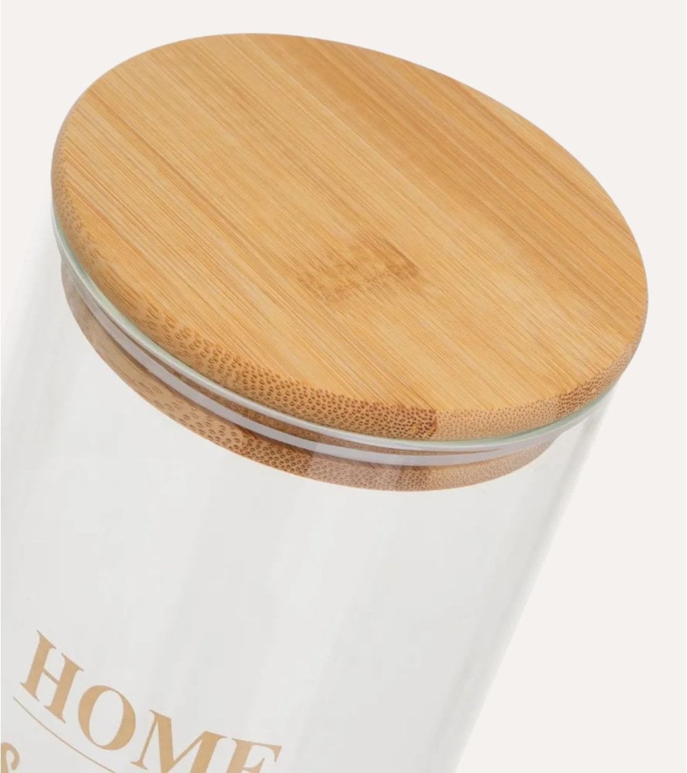 Este tarro hogar con tapa de bambú es perfecto para la ordenación de cocina. Su diseño cilíndrico es práctico y estéticamente atractivo, con la frase HOME sweet HOME impresa en un elegante tono dorado. Disponible en tres tamaños: 1700 ml, 1300 ml y 1000 ml, es ideal para almacenar alimentos secos, especias o incluso artículos de oficina y manualidades. Fabricado en vidrio resistente y tapa de bambú sostenible, este tarro evoca una atmósfera hogareña perfecta para cualquier cocina moderna o rústica. No es apto para lavavajillas, se recomienda lavar a mano.