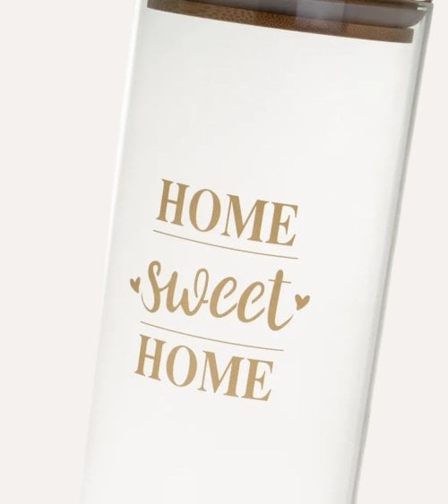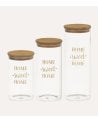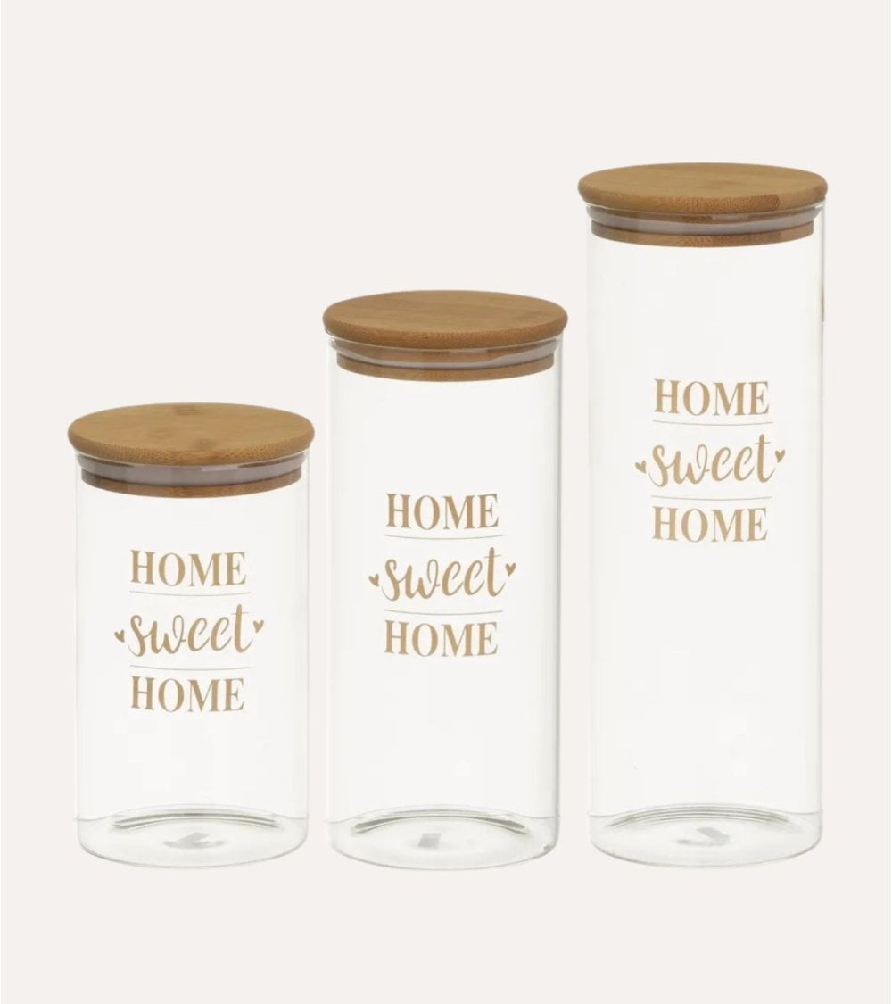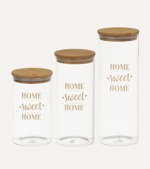 Cada tarro presenta un diseño cilíndrico que no solo es práctico, sino también estéticamente atractivo. Con la frase "HOME sweet HOME" impresa en un elegante tono dorado, estos tarros evocan una atmósfera hogareña perfecta para cualquier cocina moderna o rústica.